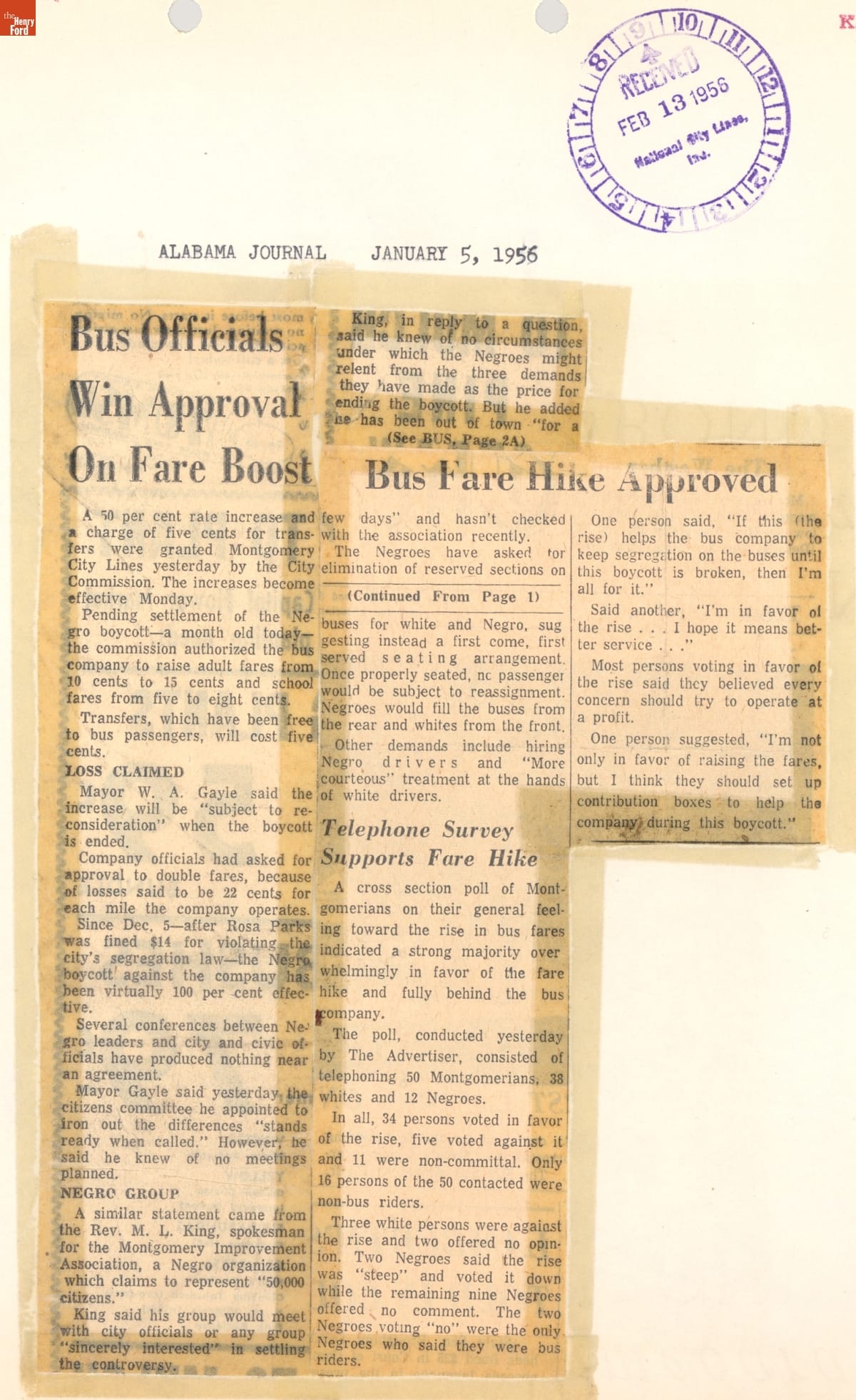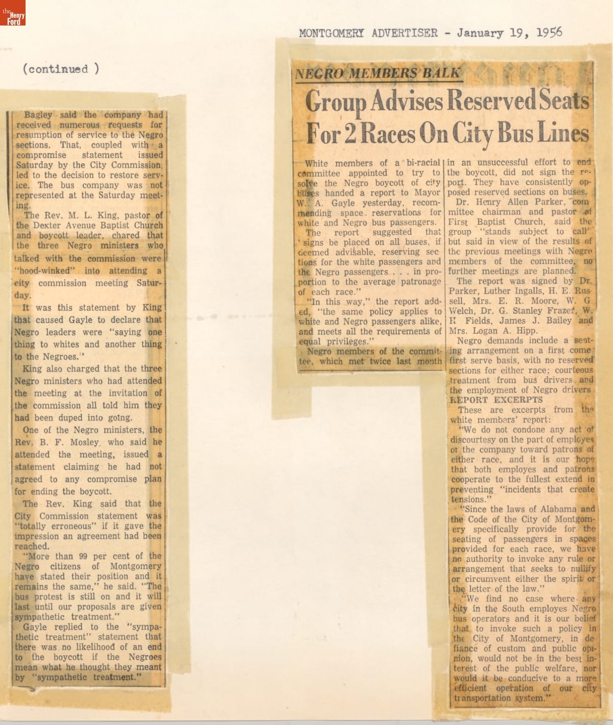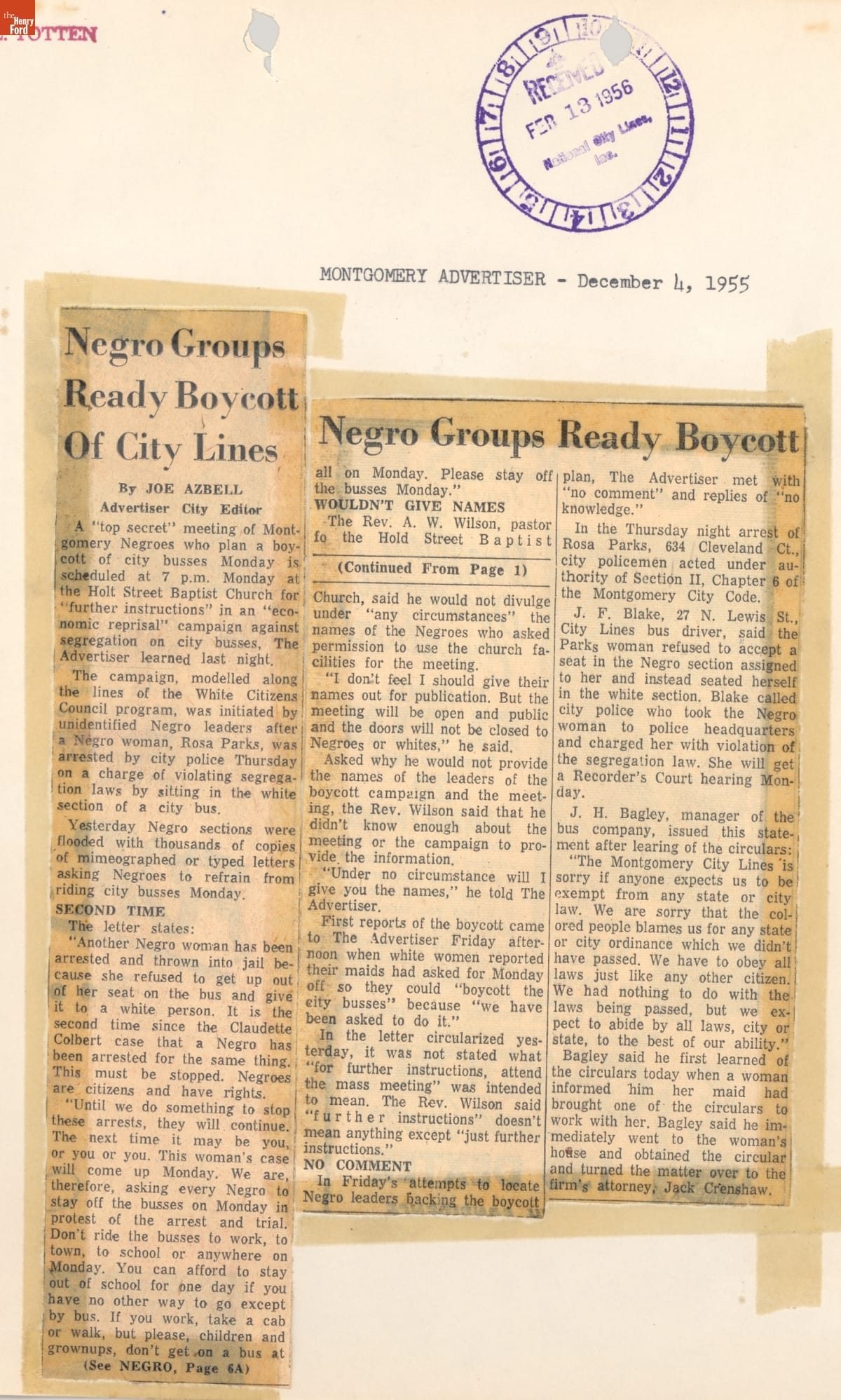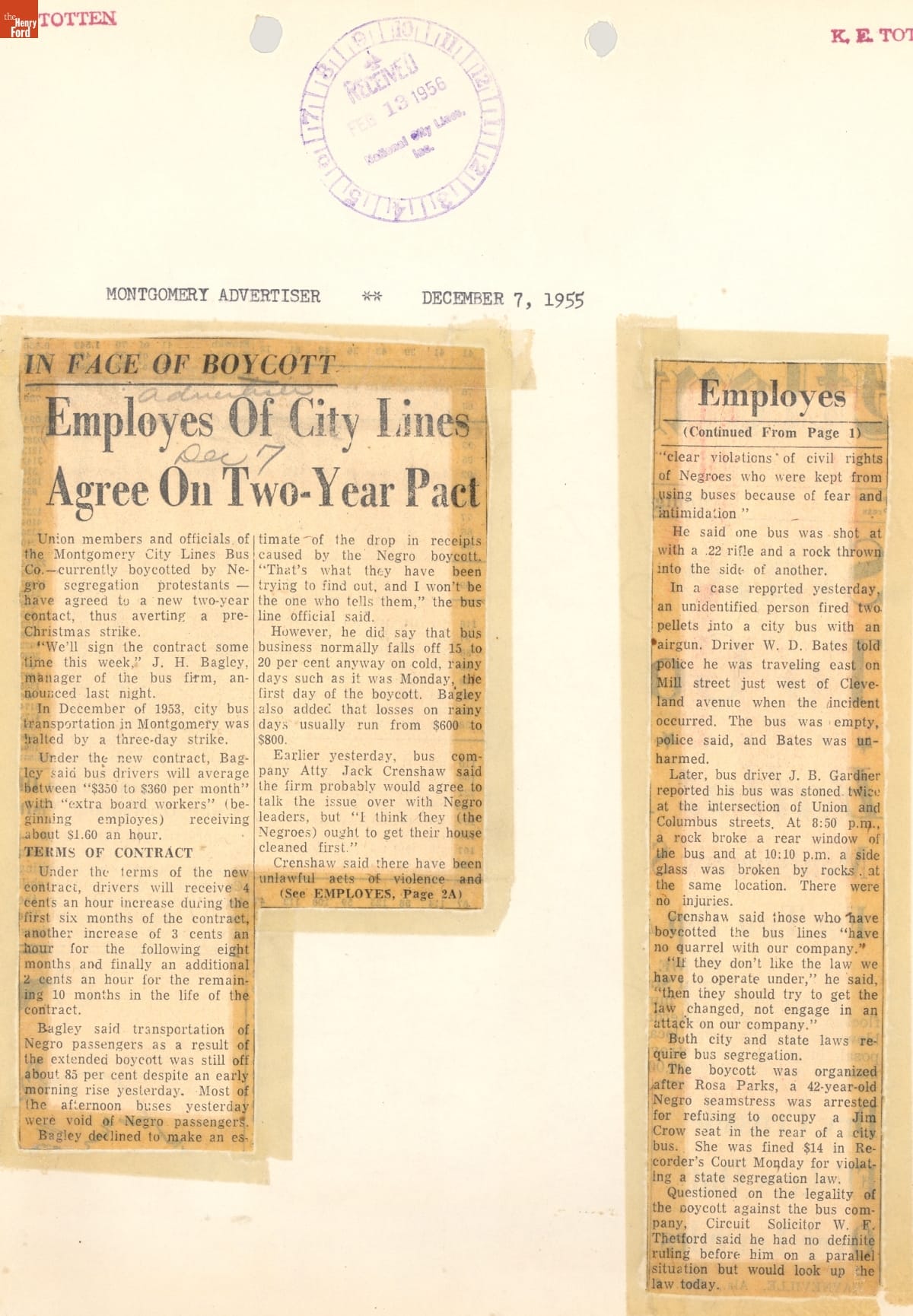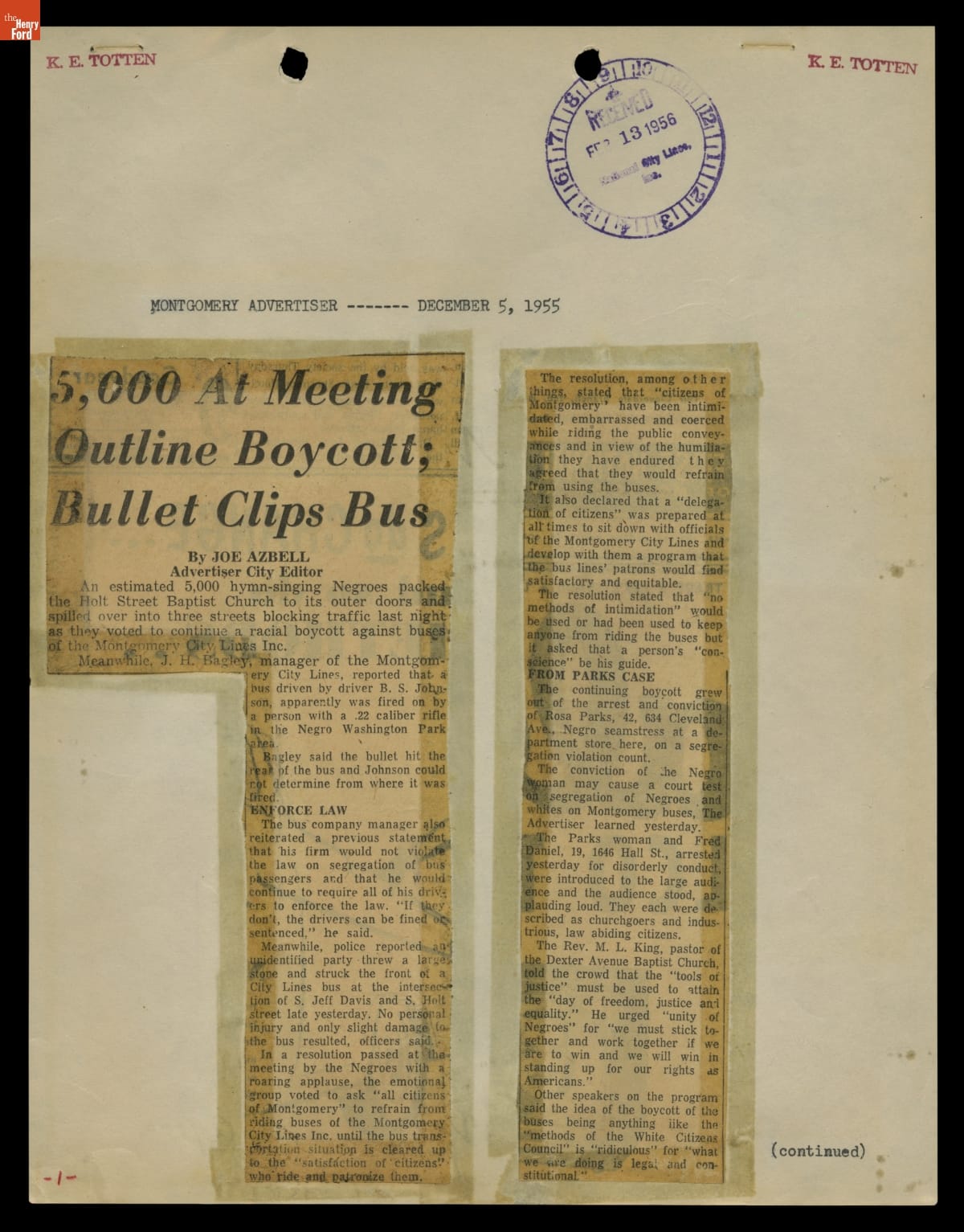 These newspaper articles come from a scrapbook of newspaper clippings saved by Charles "Homer" Cummings, a Montgomery City bus lines manager. Together, these articles recount the story of the 381-day Montgomery bus boycott that was inspired by the arrest of Rosa Parks, who refused to give up her bus seat to a white man despite existing segregation laws.