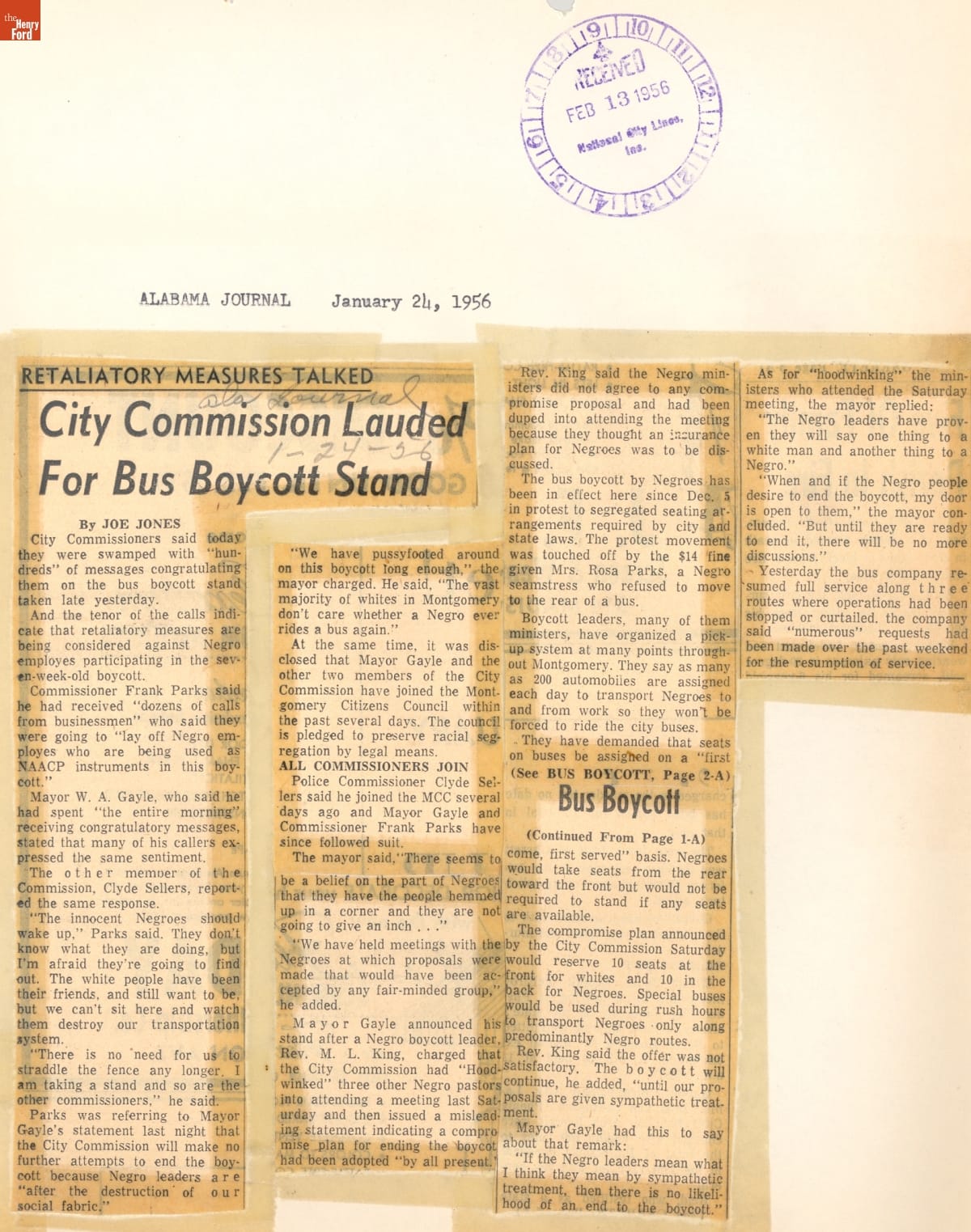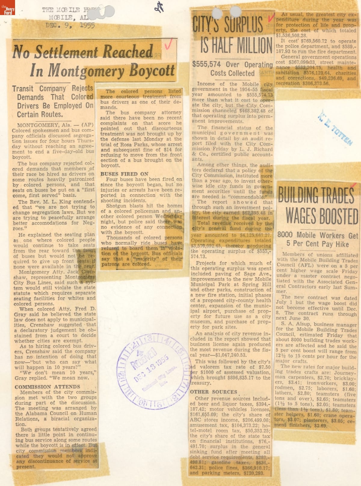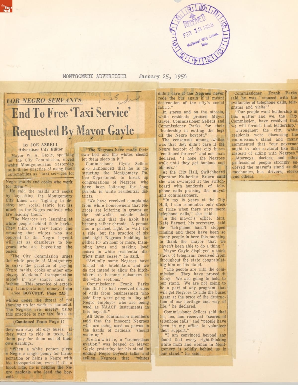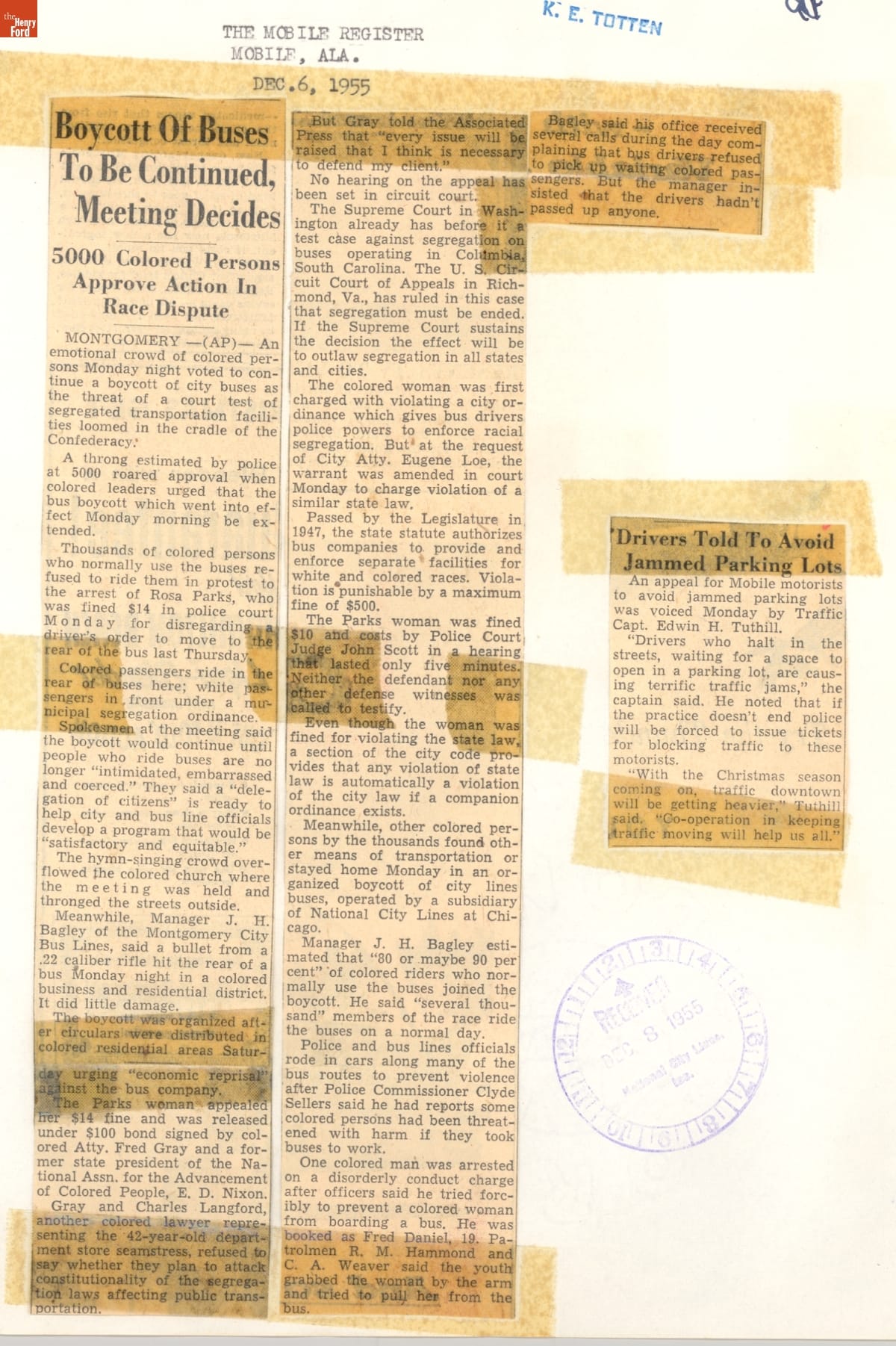 These newspaper articles come from a scrapbook of newspaper clippings saved by Charles "Homer" Cummings, a Montgomery City bus lines manager. Together, these articles recount the story of the 381-day Montgomery bus boycott that was inspired by the arrest of Rosa Parks, who refused to give up her bus seat to a white man despite existing segregation laws.