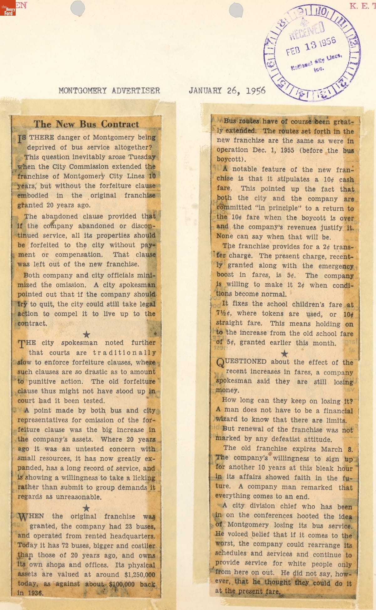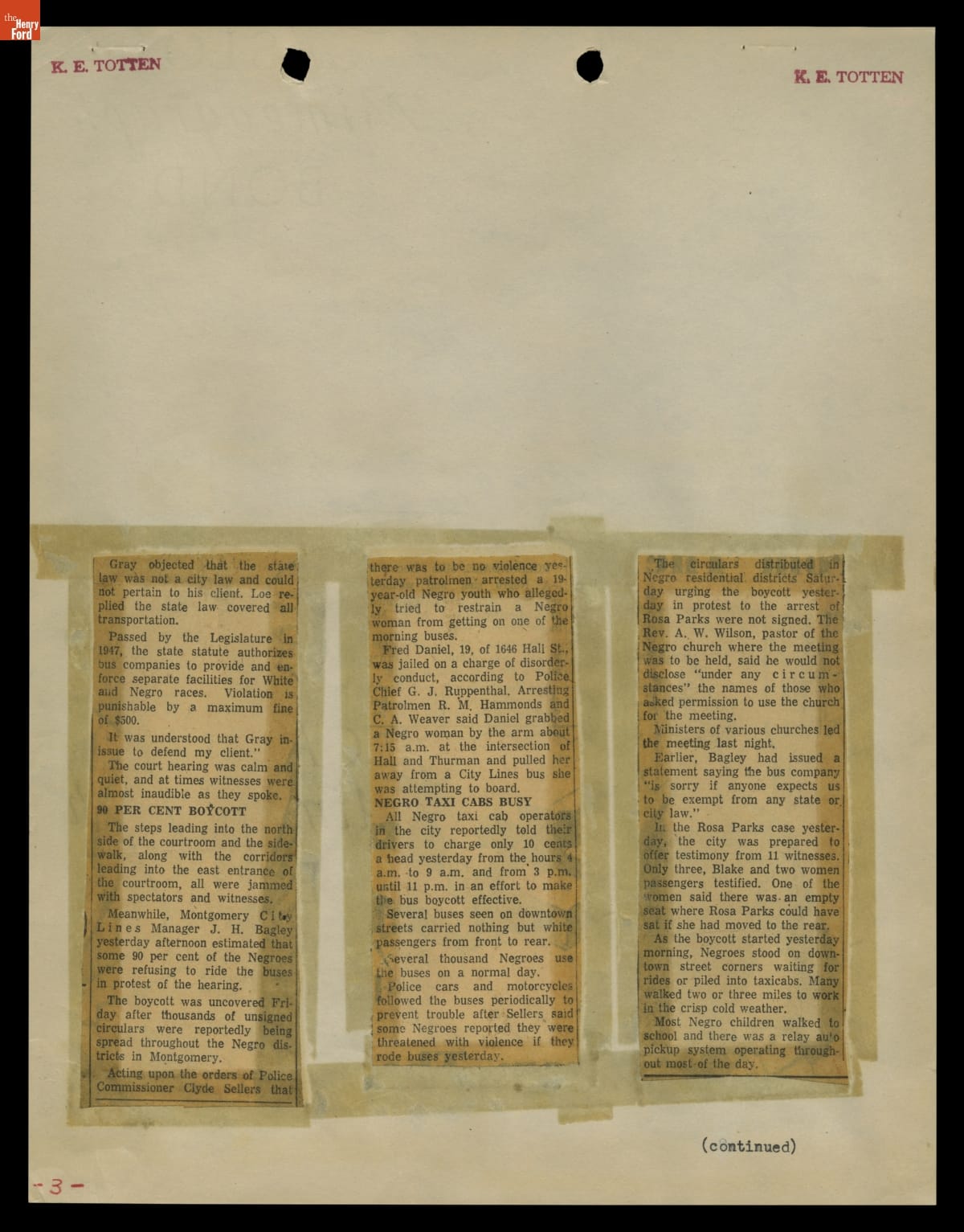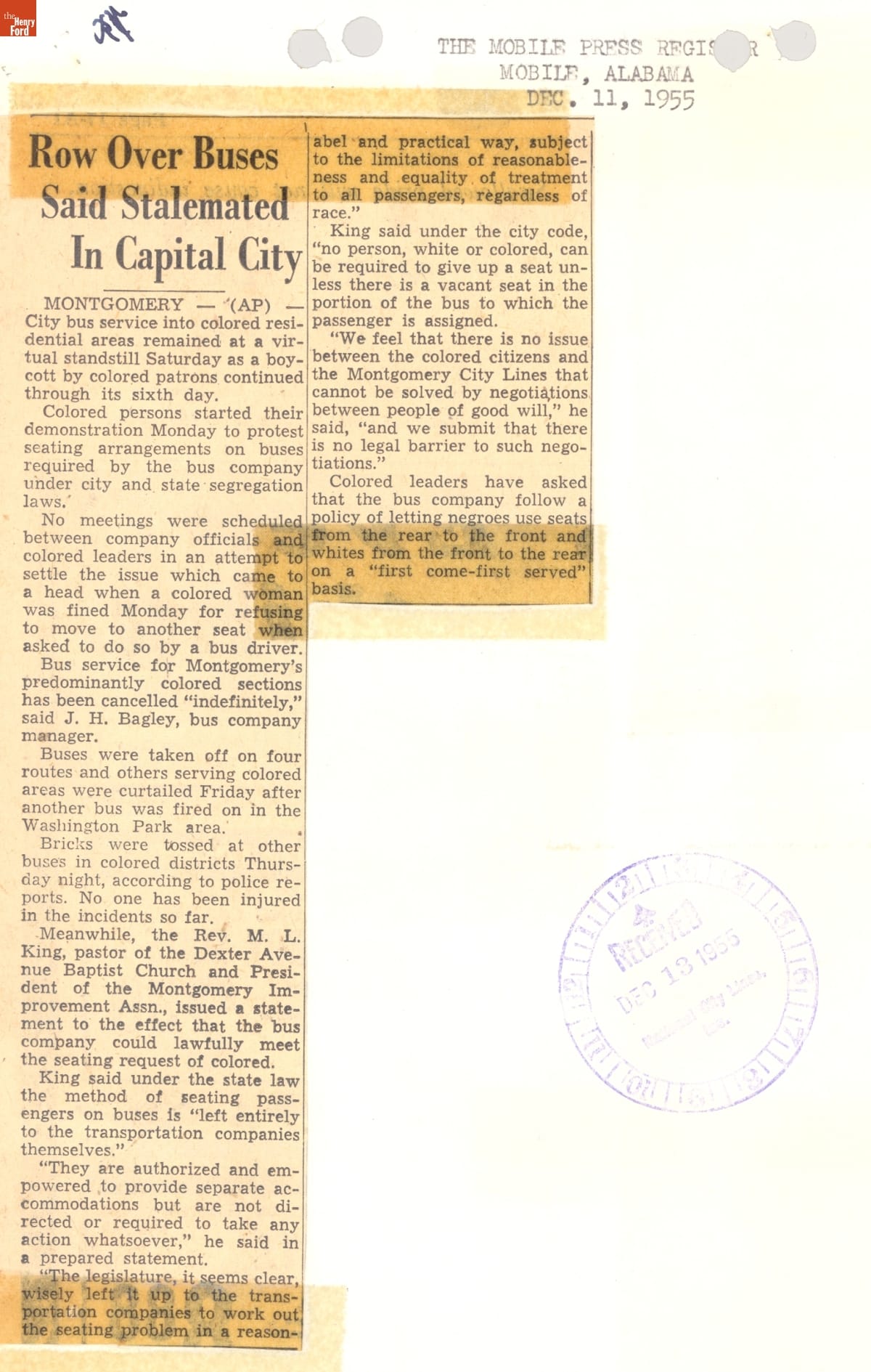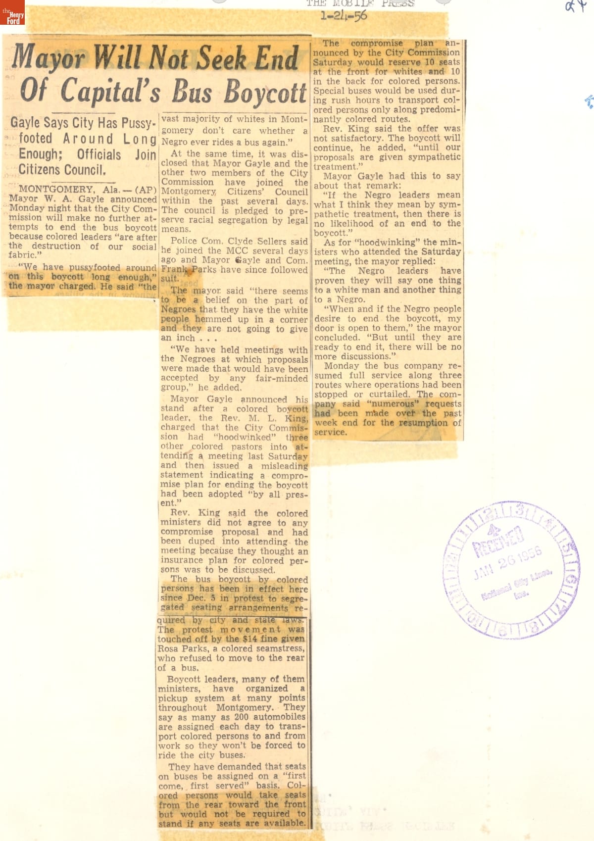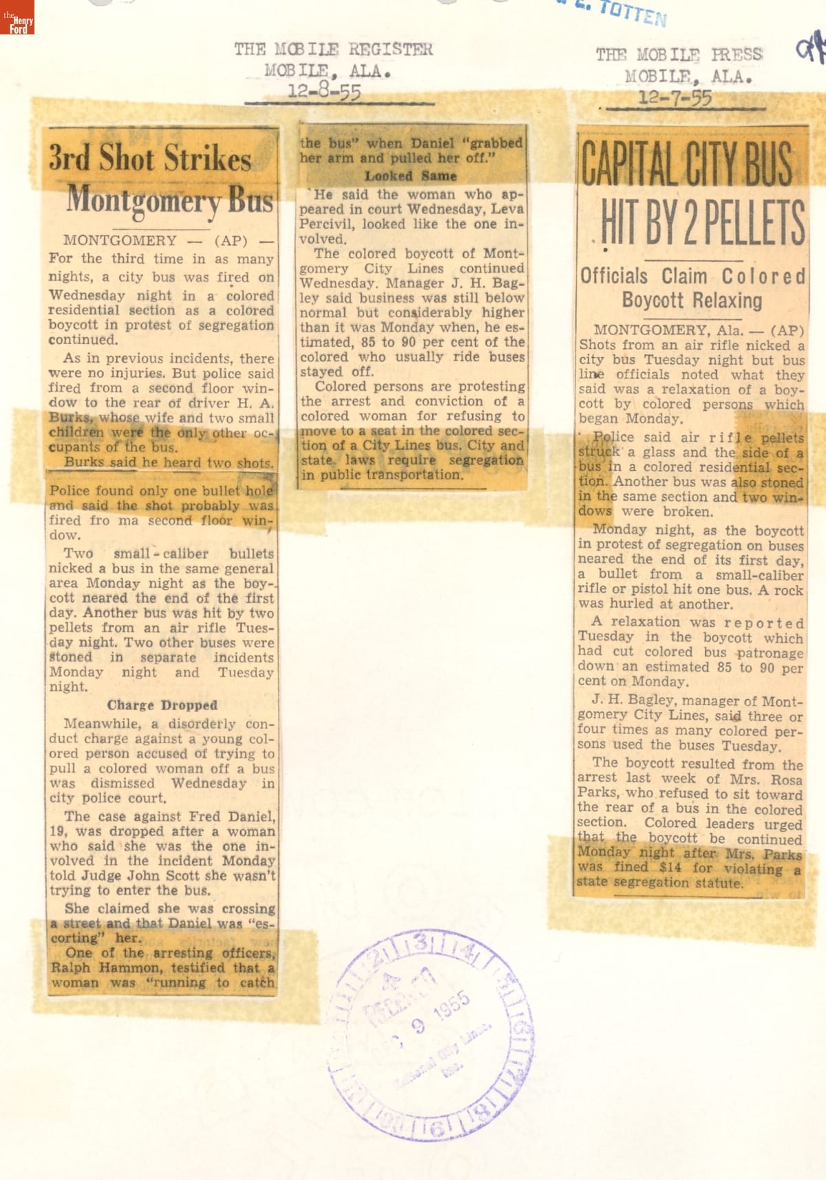 These newspaper articles come from a scrapbook of newspaper clippings saved by Charles "Homer" Cummings, a Montgomery City bus lines manager. Together, these articles recount the story of the 381-day Montgomery bus boycott that was inspired by the arrest of Rosa Parks, who refused to give up her bus seat to a white man despite existing segregation laws.