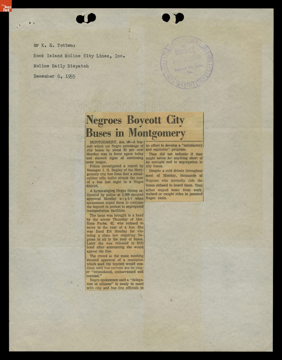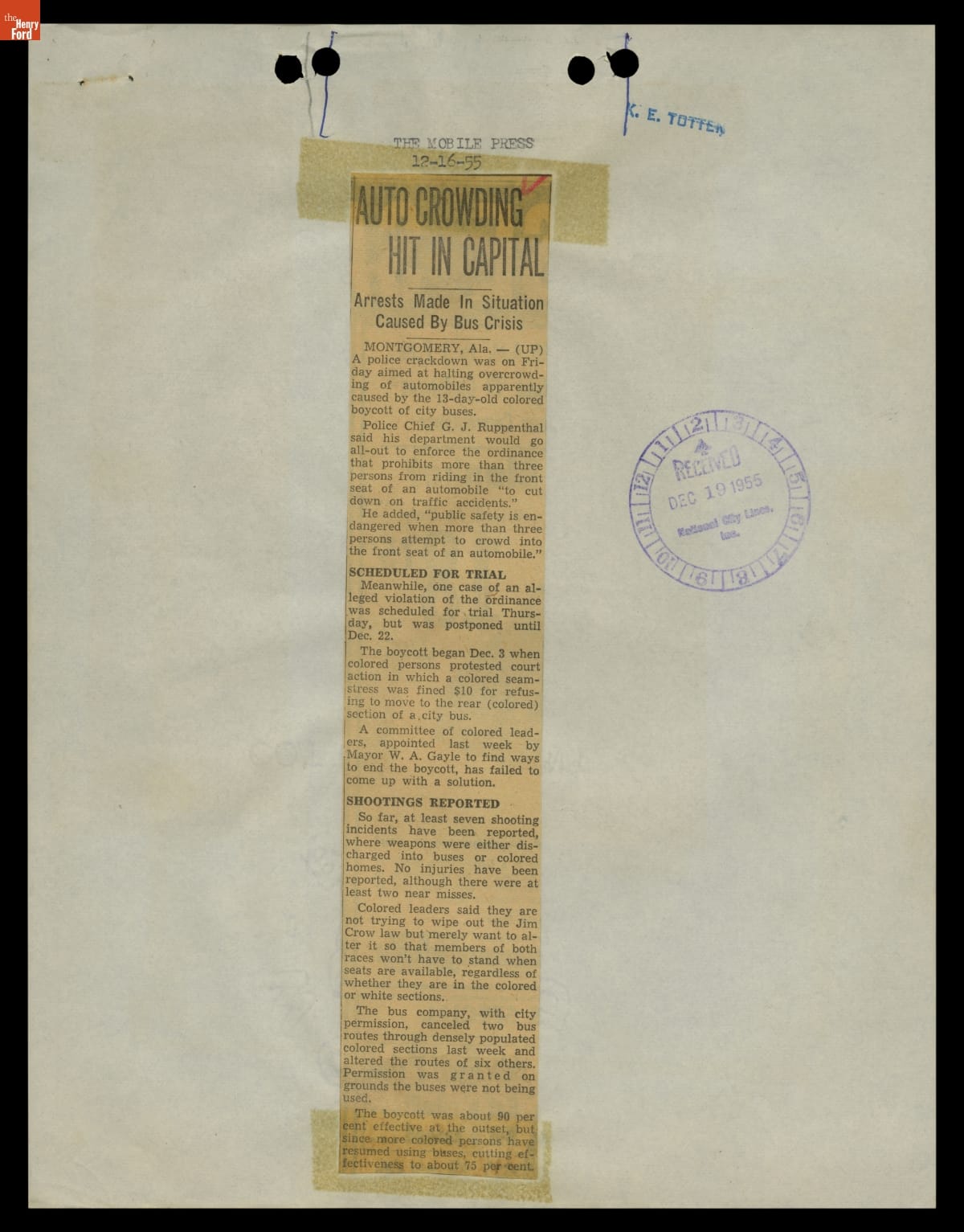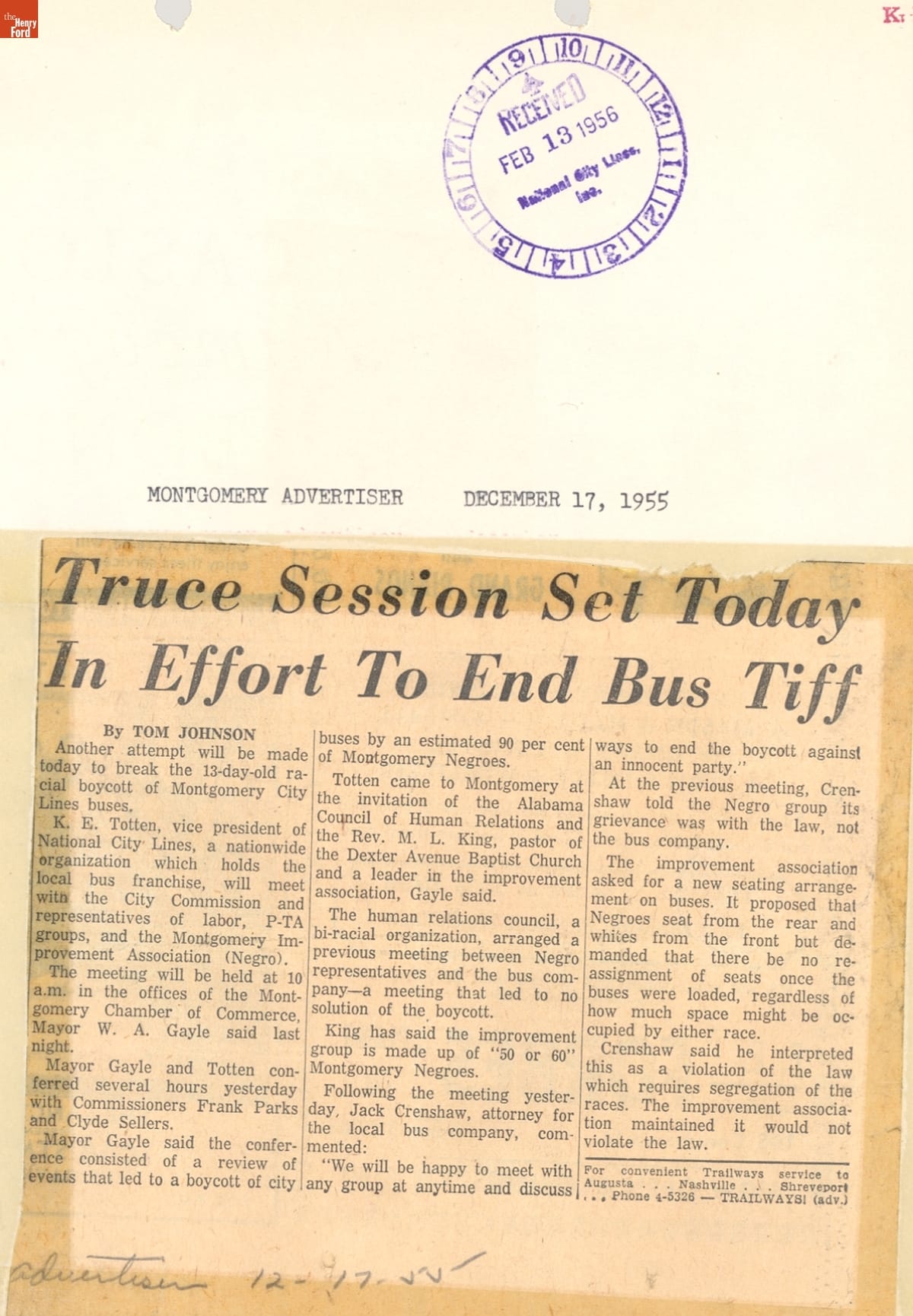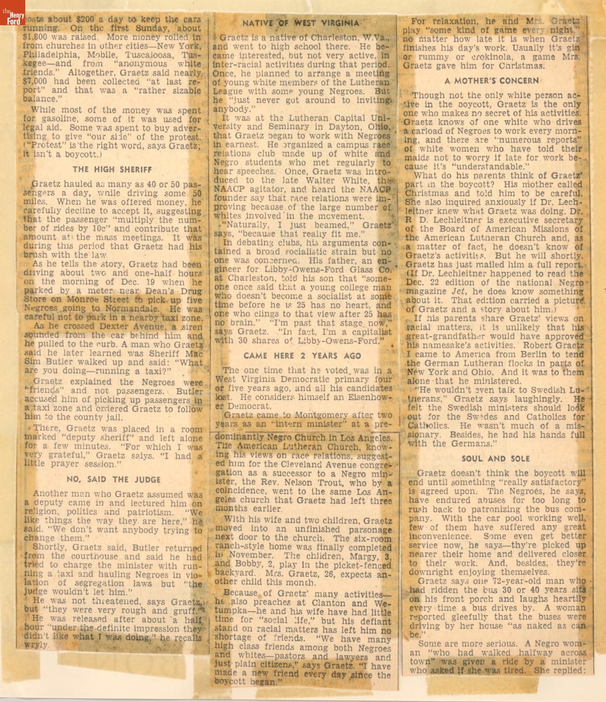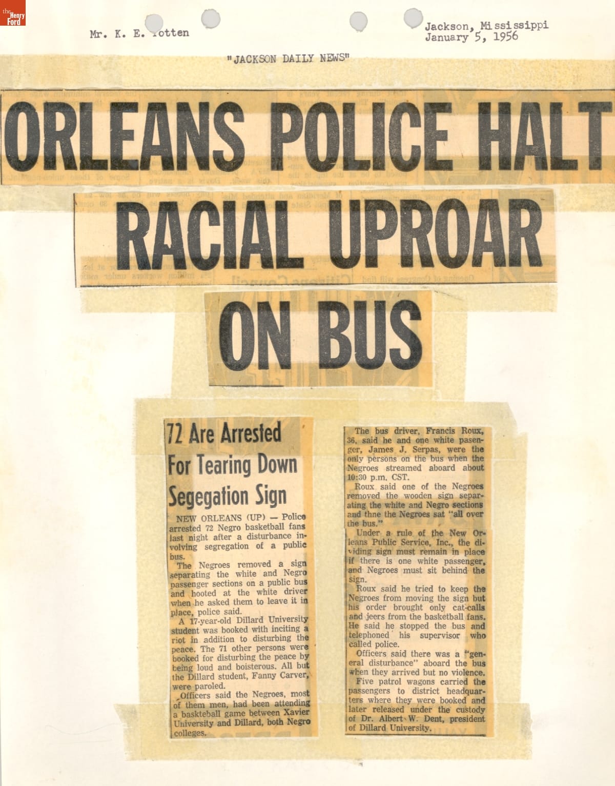 These newspaper articles come from a scrapbook of newspaper clippings saved by Charles "Homer" Cummings, a Montgomery City bus lines manager. Together, these articles recount the story of the 381-day Montgomery bus boycott that was inspired by the arrest of Rosa Parks, who refused to give up her bus seat to a white man despite existing segregation laws.