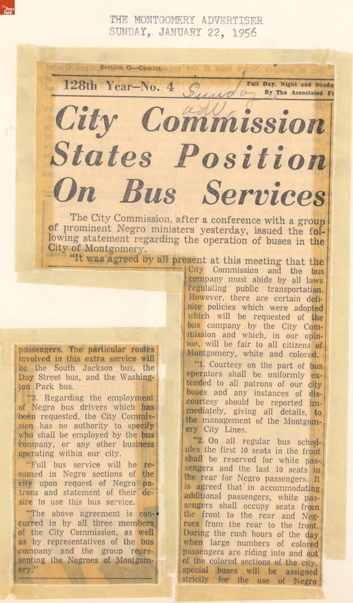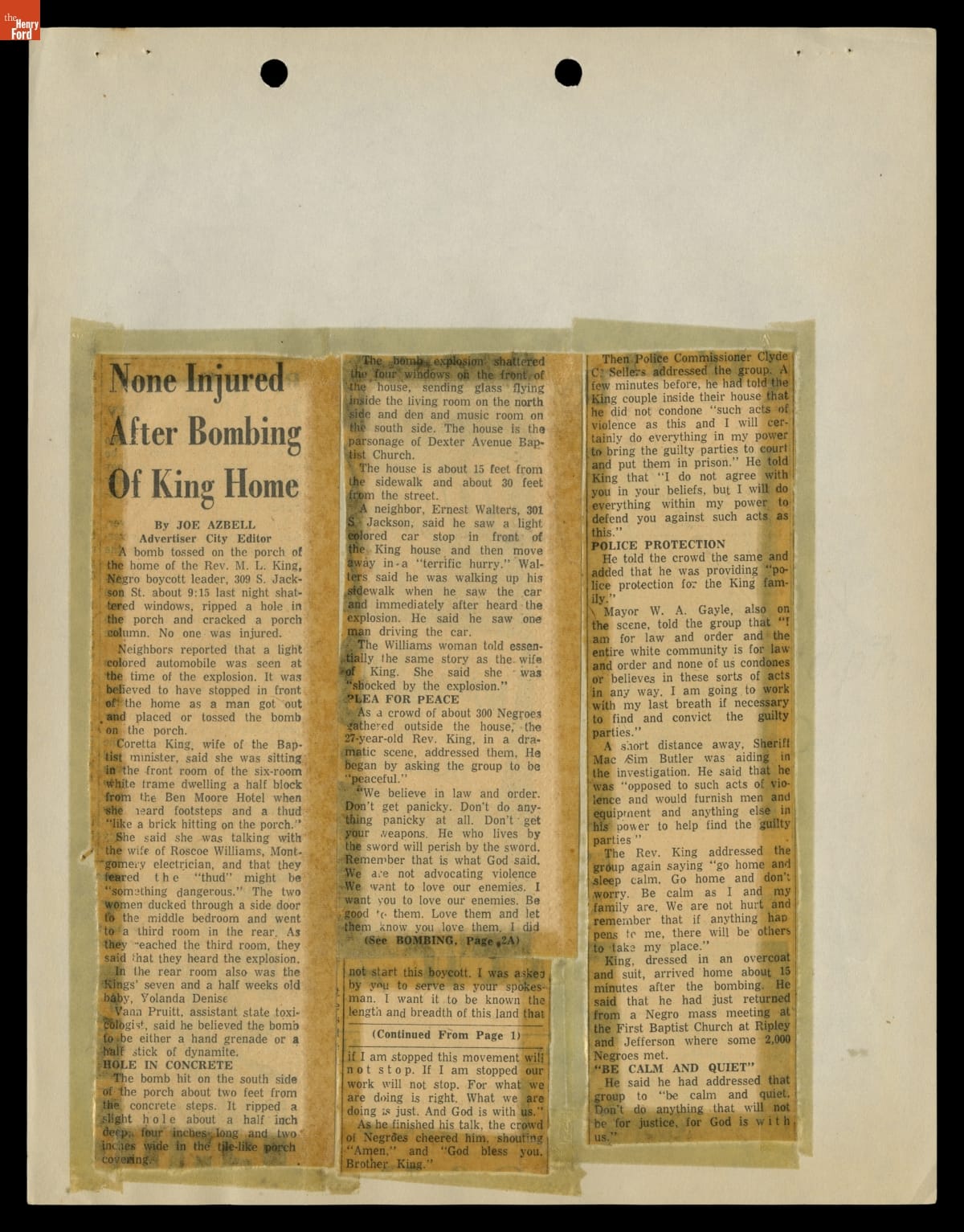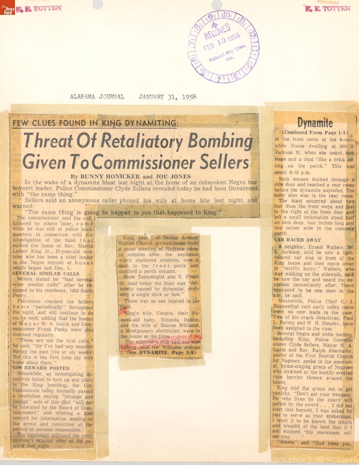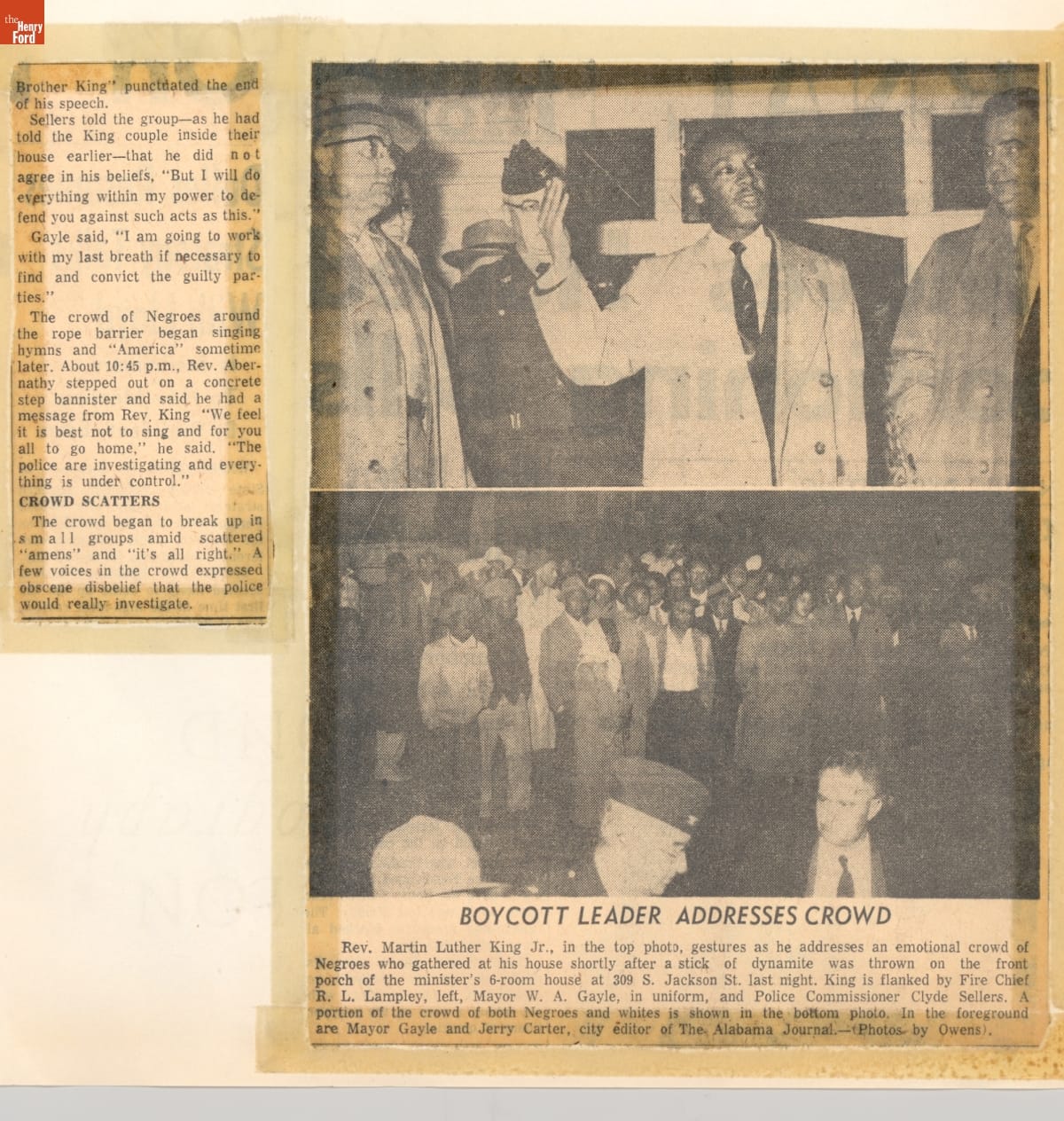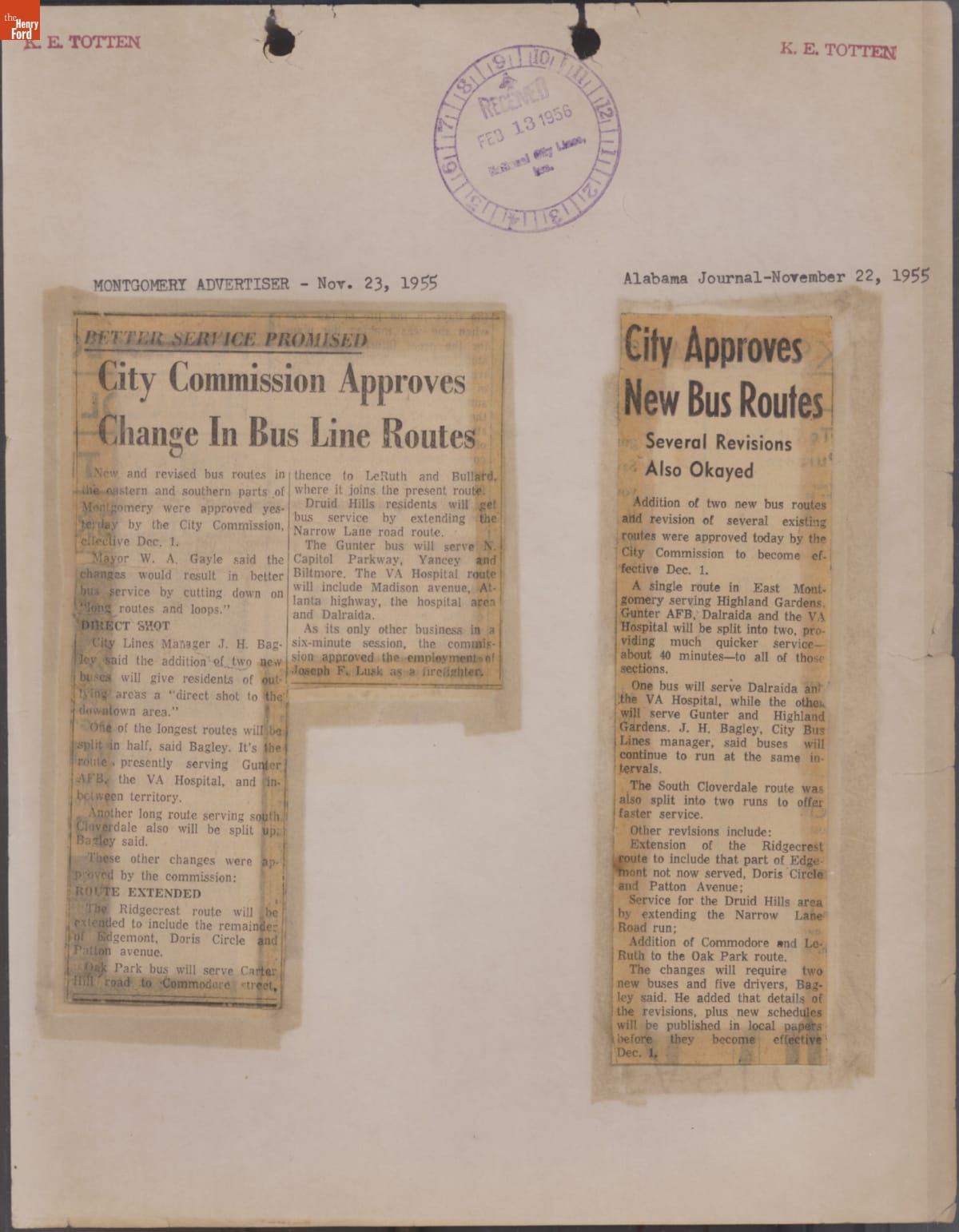 These newspaper articles come from a scrapbook of newspaper clippings saved by Charles "Homer" Cummings, a Montgomery City bus lines manager. Together, these articles recount the story of the 381-day Montgomery bus boycott that was inspired by the arrest of Rosa Parks, who refused to give up her bus seat to a white man despite existing segregation laws.
