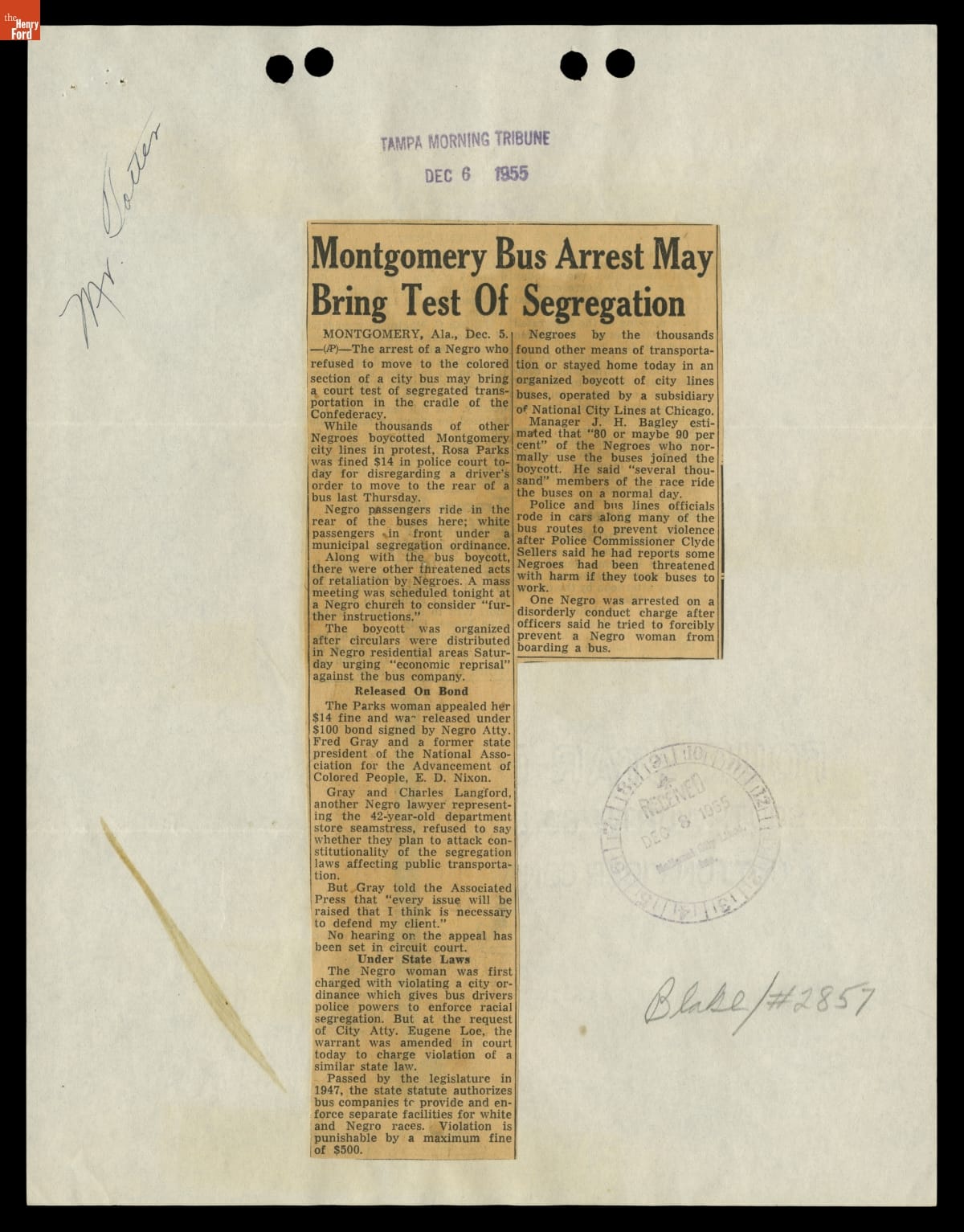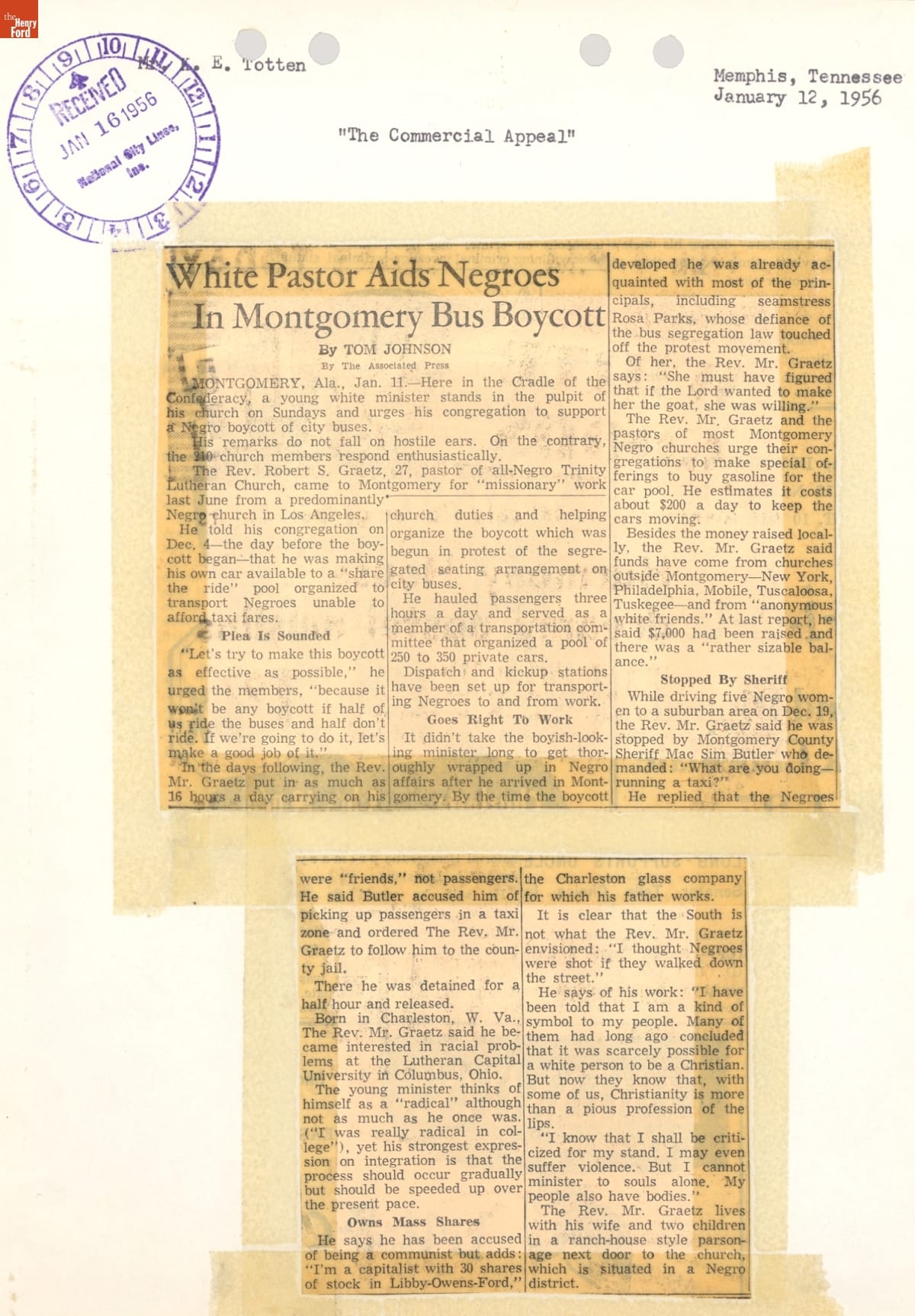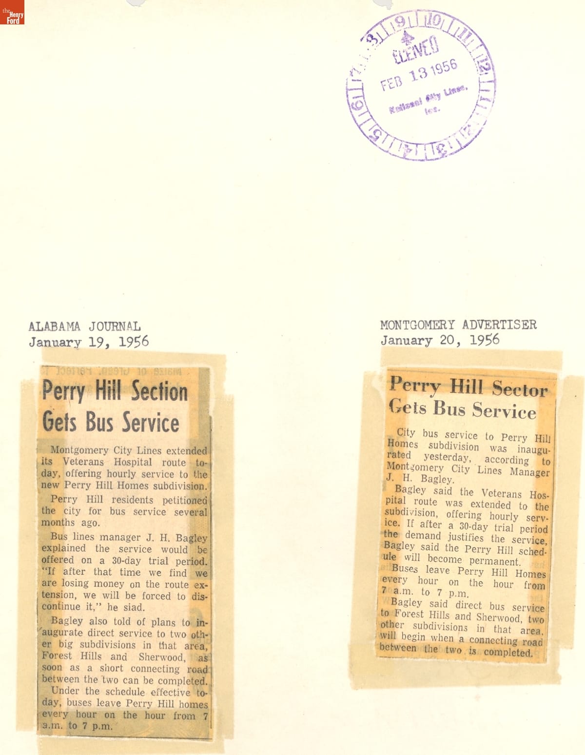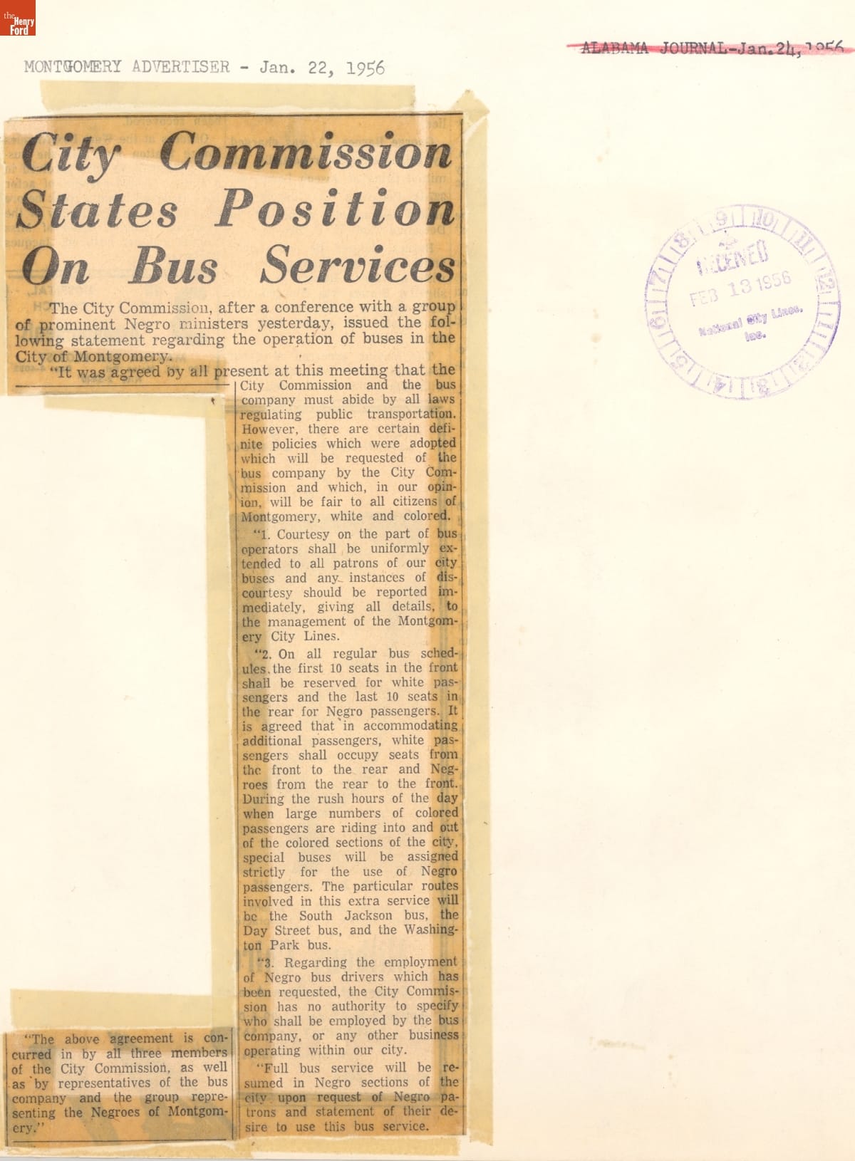These newspaper articles come from a scrapbook of newspaper clippings saved by Charles "Homer" Cummings, a Montgomery City bus lines manager. Together, these articles recount the story of the 381-day Montgomery bus boycott that was inspired by the arrest of Rosa Parks, who refused to give up her bus seat to a white man despite existing segregation laws.
