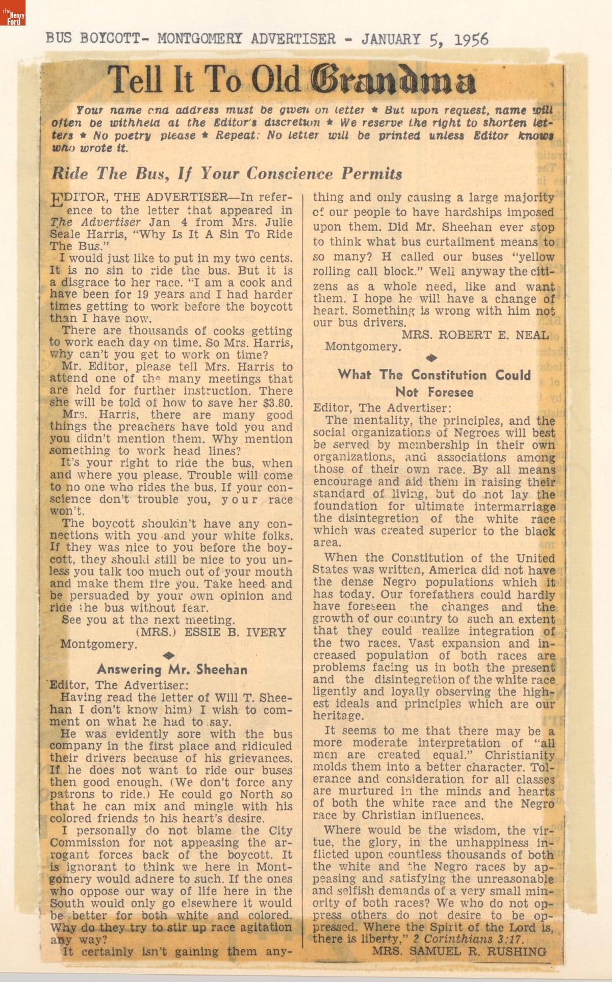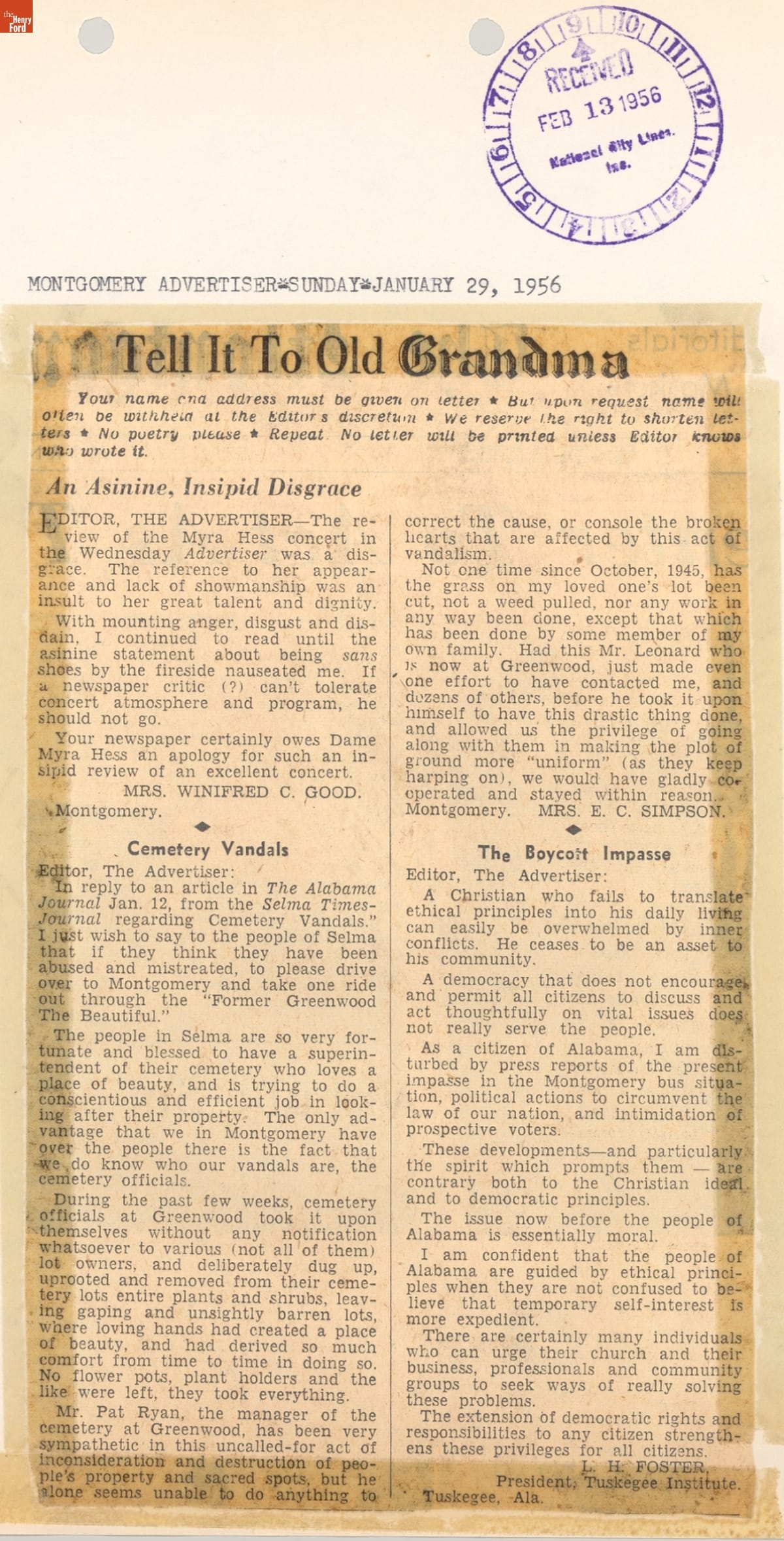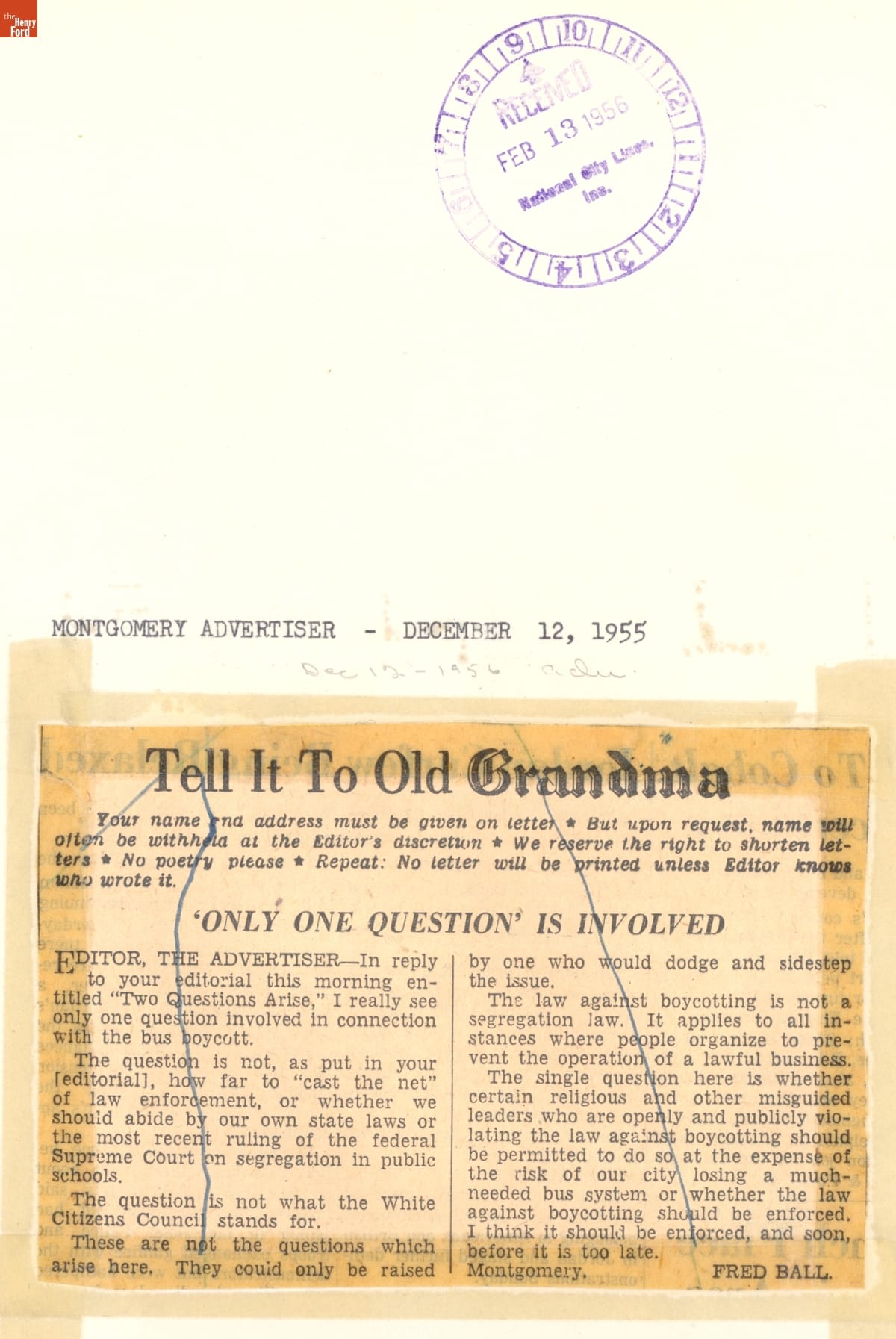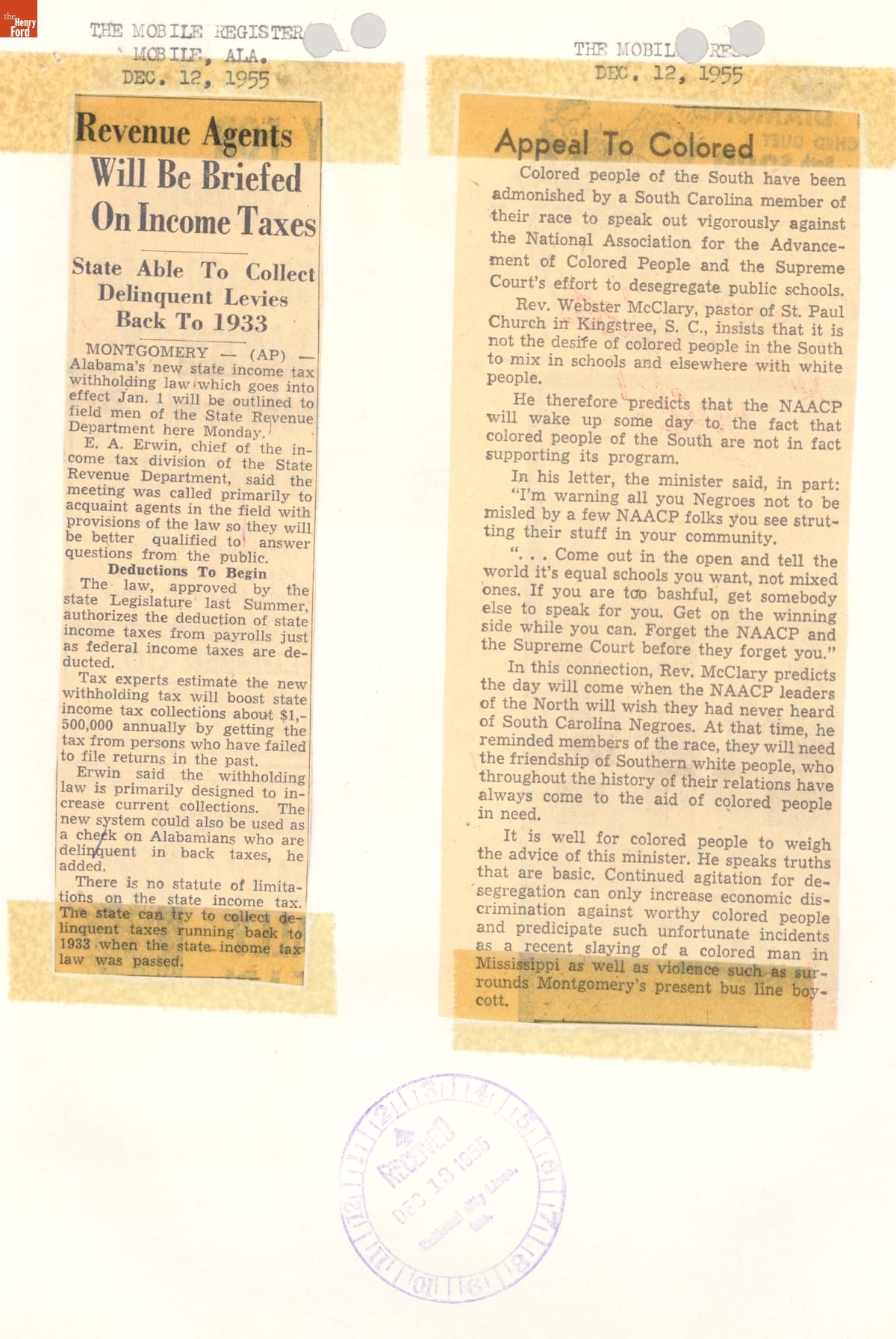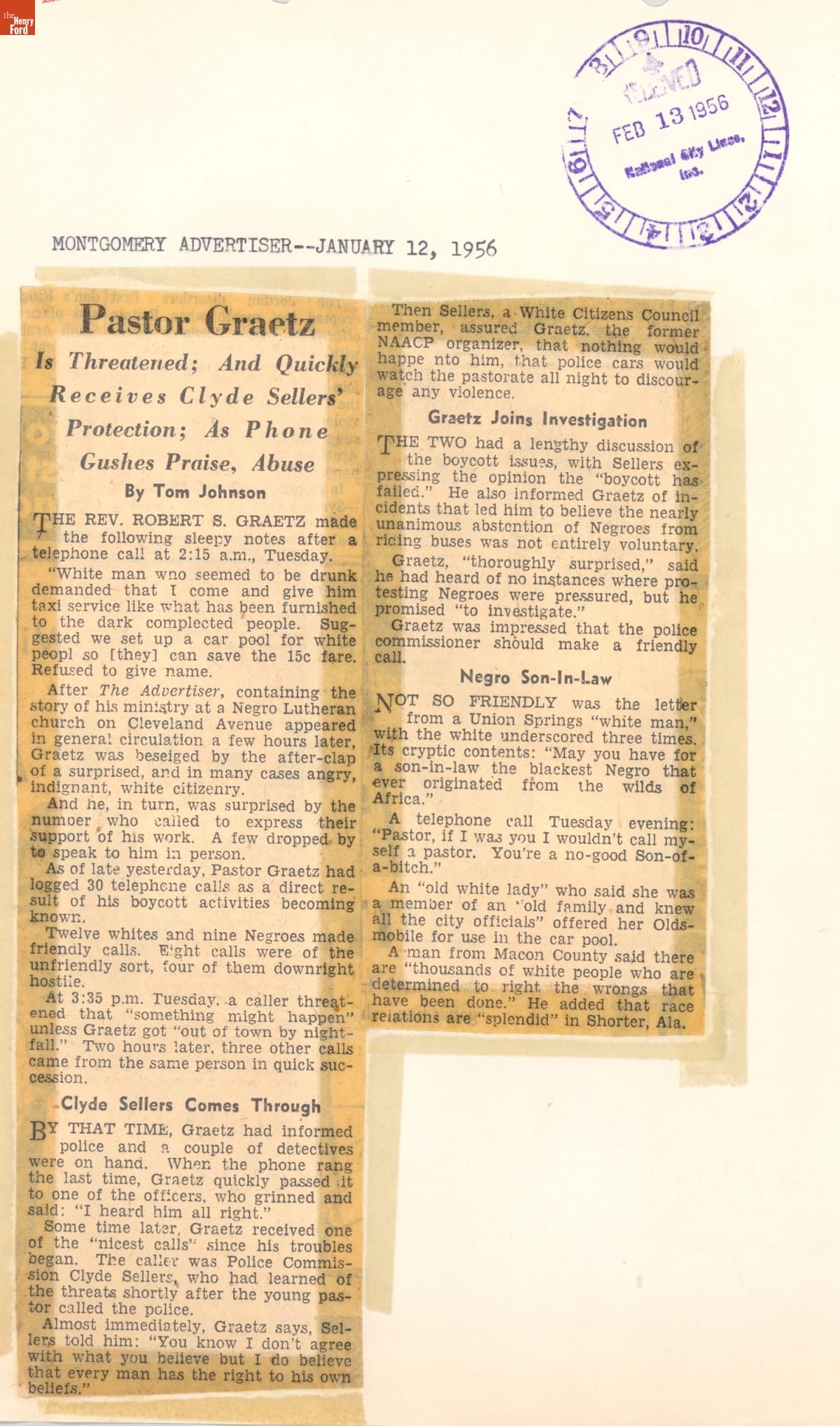These newspaper articles come from a scrapbook of newspaper clippings saved by Charles "Homer" Cummings, a Montgomery City bus lines manager. Together, these articles recount the story of the 381-day Montgomery bus boycott that was inspired by the arrest of Rosa Parks, who refused to give up her bus seat to a white man despite existing segregation laws.