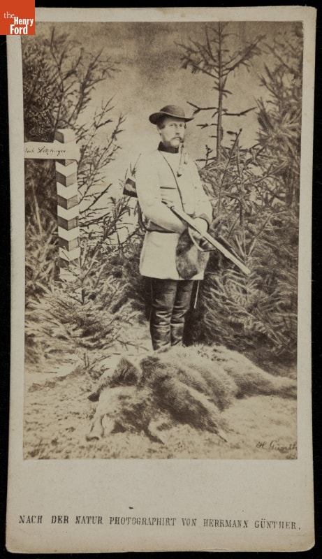 A man in hunting clothing posed with a wild boar at his feet for photographer Hermann Gunther around 1870. This portrait carte-de-visite is a product of his sitting. Cartes-de-visite, small photographic prints on cardboard stock, were popular in the United States from the 1860s through the 1880s. Americans commonly collected and exchanged them to commemorate family members or celebrities.