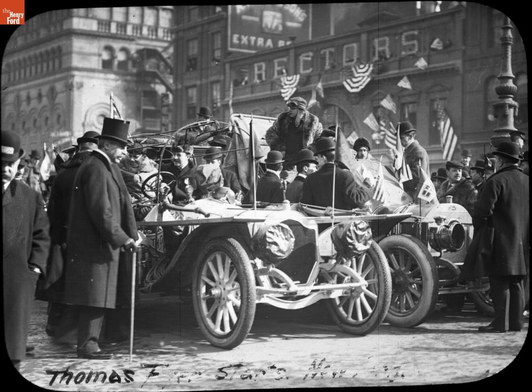 American Thomas Flyer and the Italian Zust in Times Square Ready for the Start of New York to Paris Race, 1908