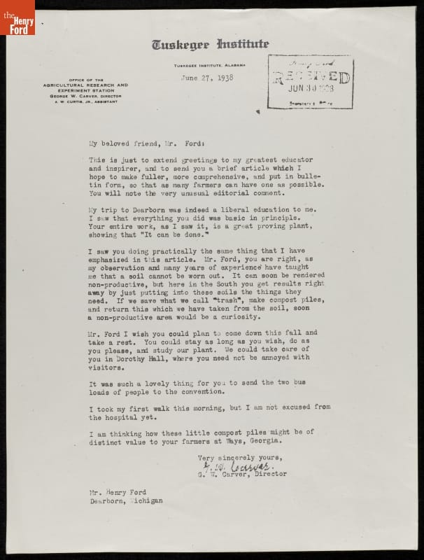 Letter from George Washington Carver to Henry Ford, June 27, 1938