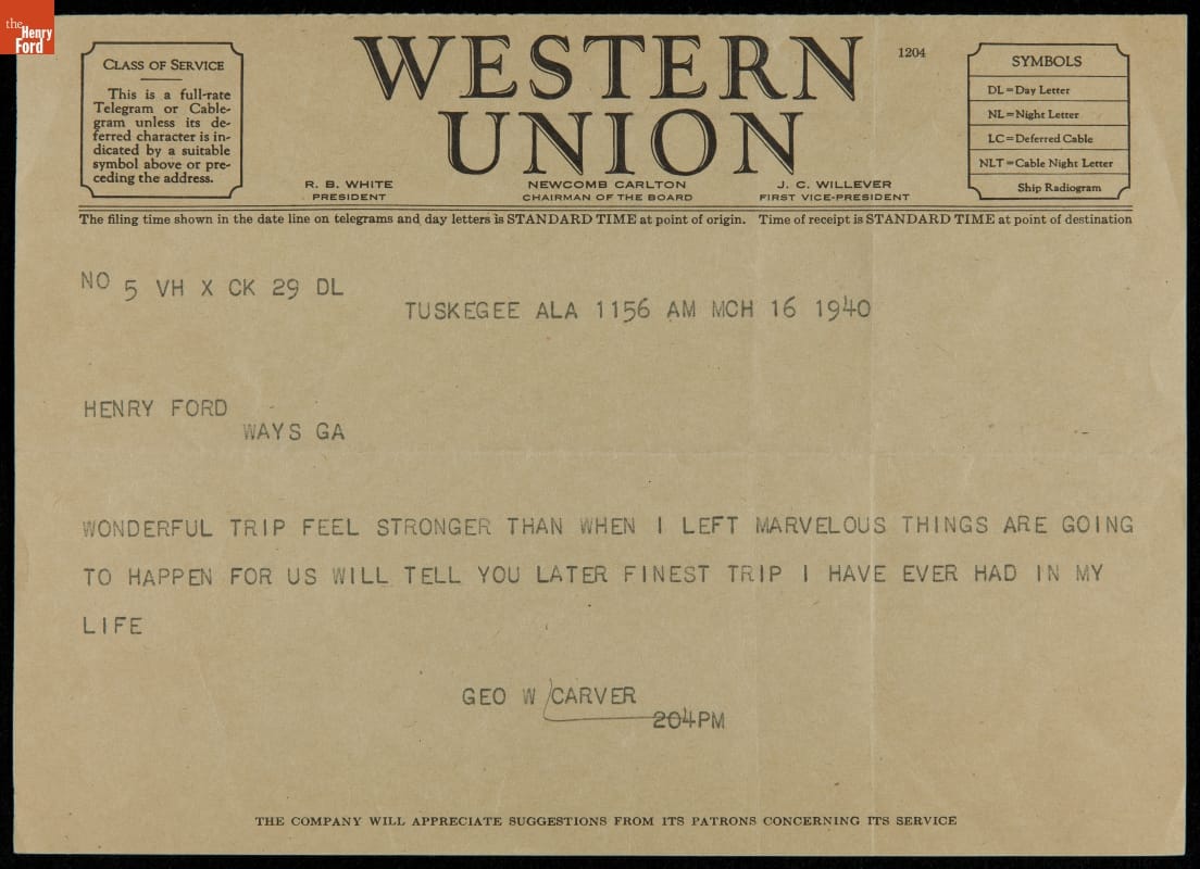 In early 1940, George Washington Carver traveled to his friend Henry Ford's property in Ways, Georgia. Ford had decided to honor Carver by naming a school after him; Carver and his assistant Austin Curtis, Jr., attended a number of dedication events at the Georgia school. When Carver returned home to Tuskegee, Alabama, he sent Ford this grateful telegram.