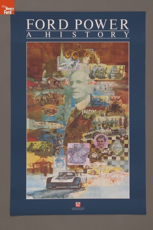 The evolution of Ford Motor Company engines is celebrated in this poster from about 1984. Race cars are prominent, but farming and construction equipment are featured as well. Portraits in the poster include racing drivers Barney Oldfield, Jim Clark and Jackie Stewart, along with Henry Ford himself.