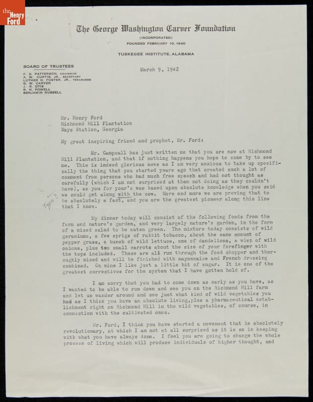 George Washington Carver and Henry Ford became friends in the late 1930s, drawn together by a mutual interest in developing new industrial products from the fruits of the soil. Carver's warm letters to Ford, Clara Ford, and Ford's secretary Frank Campsall speak to the genuine depth of the friendship. Carver often gives Ford advice on research avenues to pursue and suggests recipes for natural health.