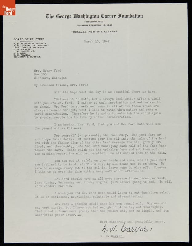 George Washington Carver and Henry Ford became friends in the late 1930s, drawn together by a mutual interest in plants and industry. Carver's warm letters to both Henry and Clara Ford speak to the genuine depth of the friendship. In this letter to Clara, which was presumably accompanied a bottle of peanut oil, Carver offered advice on how to use the oil for natural health.