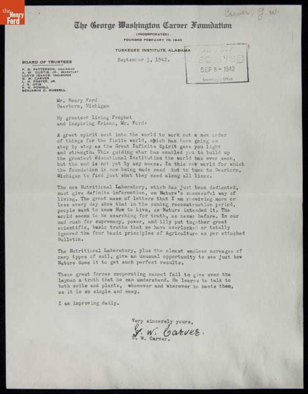 Letter from George Washington Carver to Henry Ford, September 3, 1942