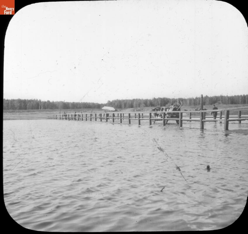 Thomas Flyer Crossing Flooded Bridge, Tomsk, Russia, New York to Paris Race, 1908