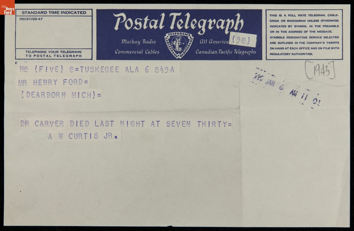 Henry Ford and conservationist George Washington Carver had been close friends beginning in the late 1930s. When Carver died in January 1943, Carver's assistant Austin Curtis, Jr. sent a telegram from Tuskegee, Alabama, where Carver had worked and taught since 1896, to Henry Ford in Dearborn. Ford sent flowers to the funeral and released a statement appreciating Carver's life and achievements.