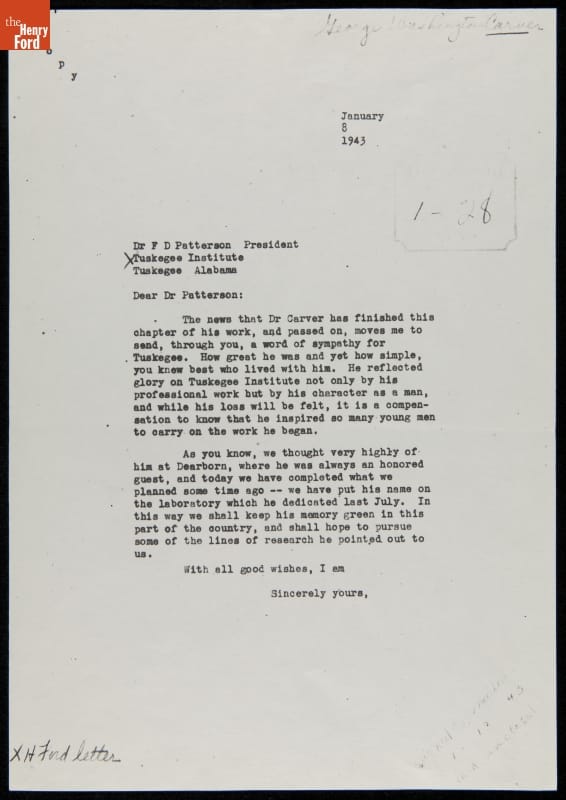 George Washington Carver died January 5, 1943. After hearing the news, his friend Henry Ford sent a letter of sympathy and appreciation to Frederick Douglass Patterson, president of the Tuskegee Institute, the university in Alabama where Carver had worked since 1896. Ford and the noted agricultural scientist had been friends and colleagues since the late 1930s.