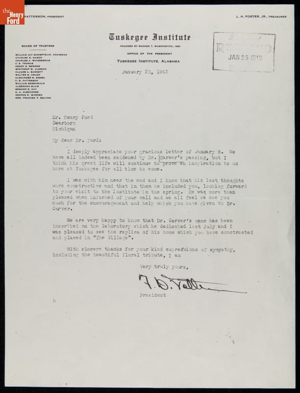 Frederick Douglass Patterson, President of the Tuskegee Institute in Alabama from 1935-1953, wrote to Henry Ford several times. Patterson thanked Ford for his kindness to Ford's friend, and longtime Tuskegee agricultural sciences educator and researcher, George Washington Carver.
