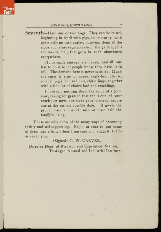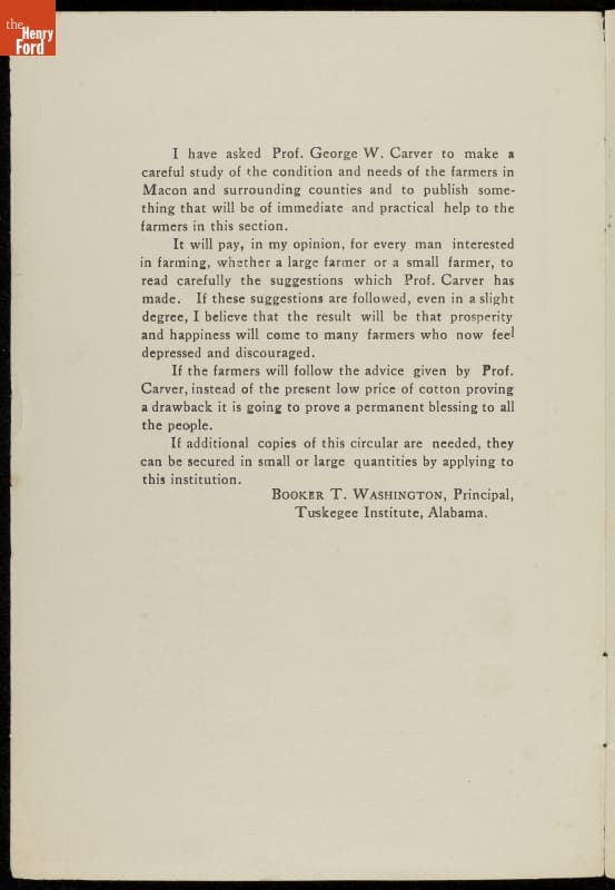 George Washington Carver directed the agricultural Experiment Station at Tuskegee Institute in Alabama. In this bulletin, Carver gives farmers suggestions for producing better crop yields and for earning additional income. Tuskegee director Booker T. Washington says in the forward that "If the farmers will follow the advice given by Prof. Carver, instead of the present low price of cotton proving a drawback it is going to prove a permanent blessing..."