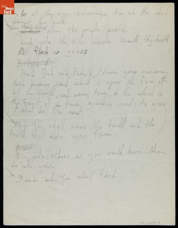 This handwritten document with list of possible names for Ford Motor Company's Nutritional Laboratory may have been written by George Washington Carver. The list may have been generated during a discussion between Carver and Irving Bacon, who was painting Carver's portrait. The laboratory was dedicated simply with Carver's name.