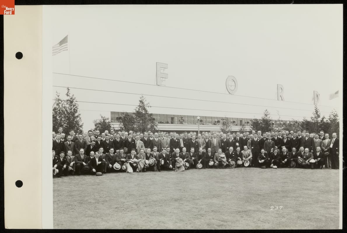 Ford Motor Company was a major exhibitor at Chicago's Century of Progress Exposition in 1934. A large exhibition building, bandshell, and Roads of the World experience composed the fair's largest and most talked-about attraction. Ford hosted this group of men, who numbered among the more than twelve million fairgoers to visit the Ford exhibit.