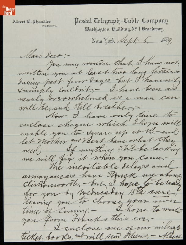 Letter from Albert B. Chandler to His Wife, Marilla, 1889