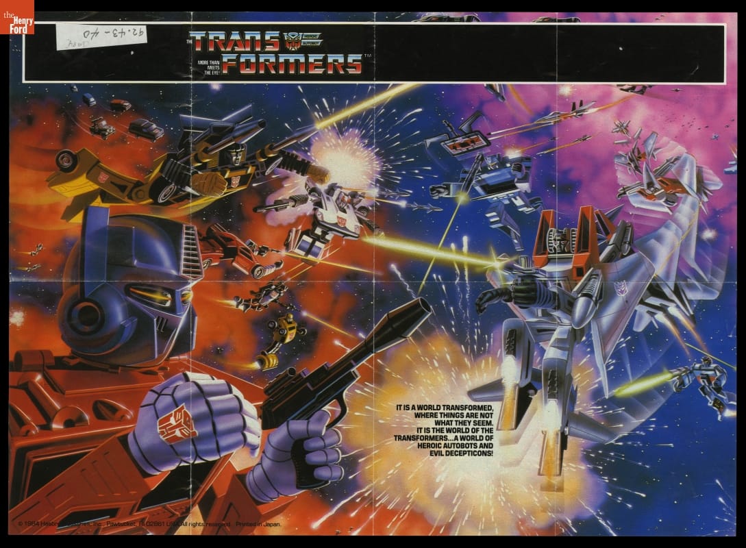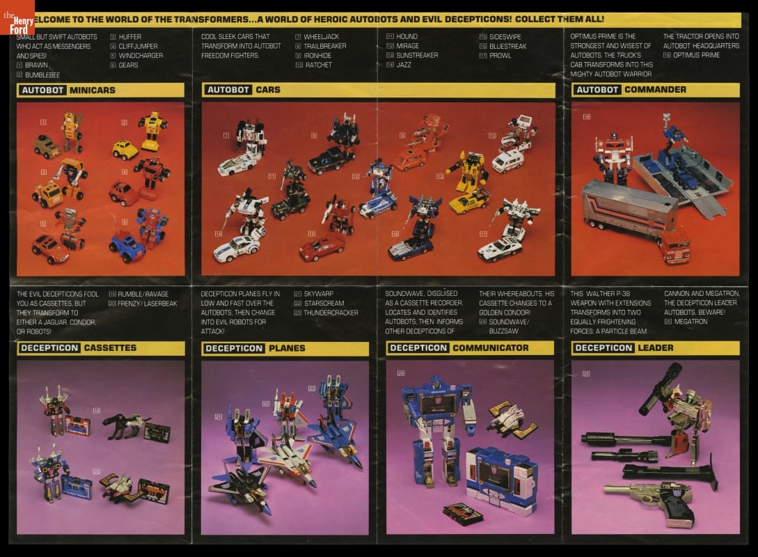 Some toys are "More than meets the eye." Transformers can change from vehicles into robots -- either good Autobots or evil Decepticons -- and back again. Released by Hasbro, Inc. in 1984, these successfully marketed action figures quickly transformed into an entertainment franchise with comic books, television shows, video games and feature-length films. This brochure shows the toys available for kids to purchase.