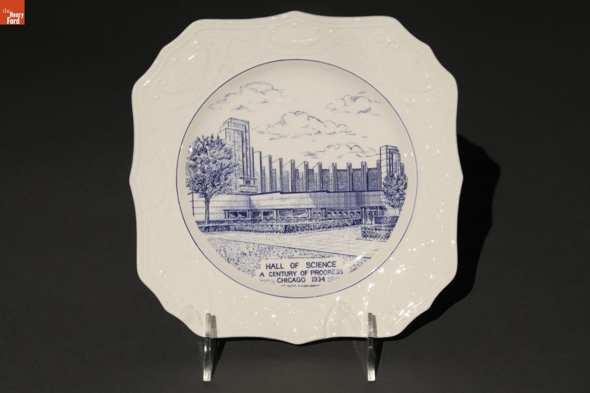 Chicago's 1933-34 Century of Progress Exposition used the theme of progress to buoy national optimism during the darkest years of the Great Depression. Many fairgoers returned home with mementos, such as souvenir plates depicting landmarks from the exposition.