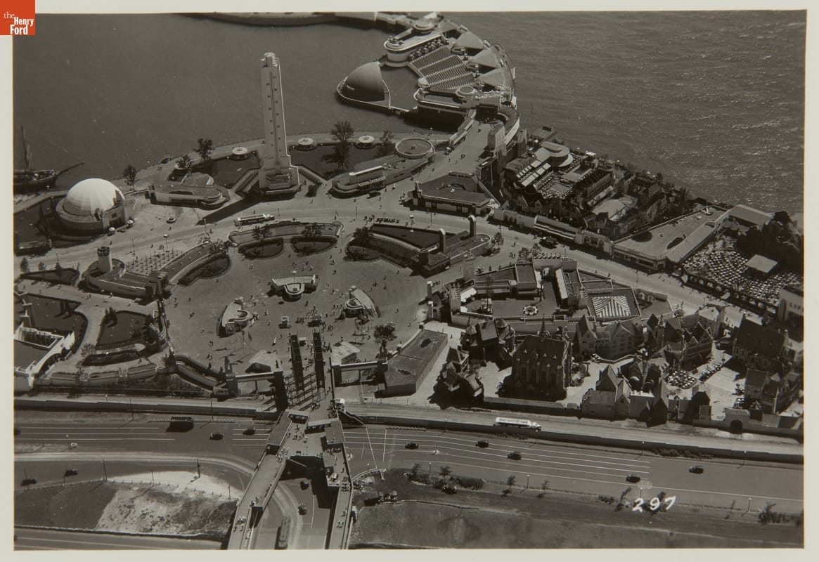 Chicago's 1933-34 Century of Progress Exposition used the theme of progress to buoy national optimism during the darkest years of the Great Depression. The fairgrounds, shown here along the Lake Michigan shoreline, boasted many exhibition buildings and attractions. The tallest structure visible here is Havoline Motor Oil's fair building -- a twenty-one story, working thermometer.