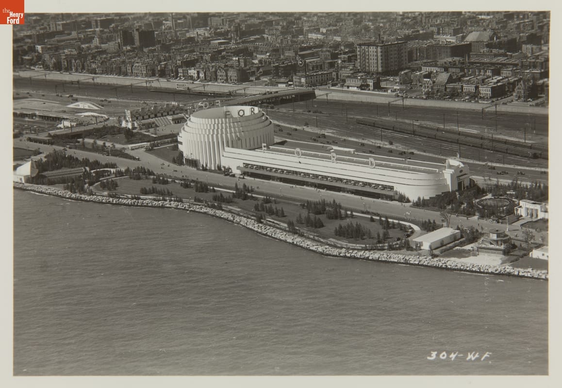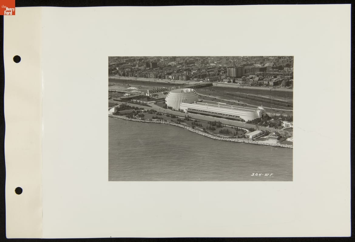 Aerial View of the Ford Rotunda and Exhibition Building, Century of Progress International Exposition, Chicago, Illinois, 1934