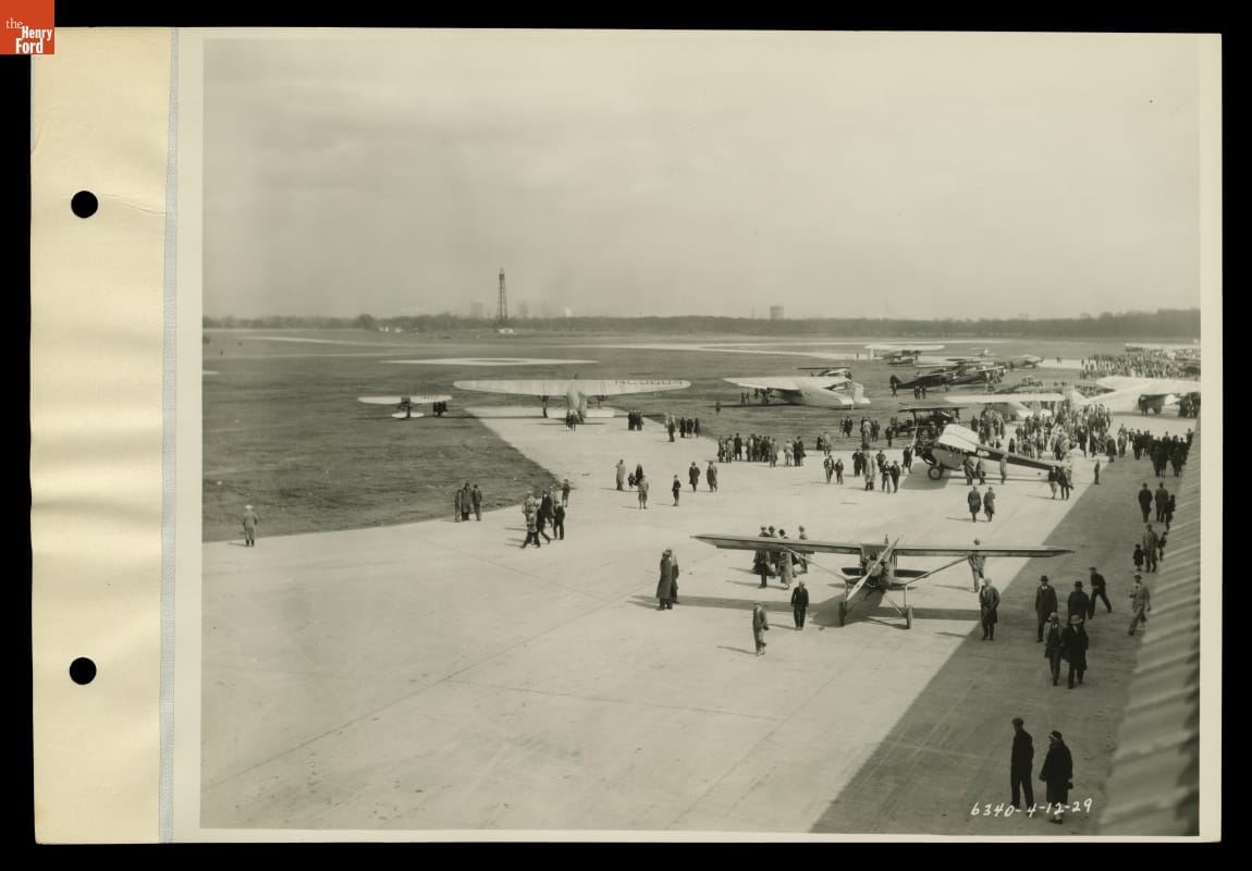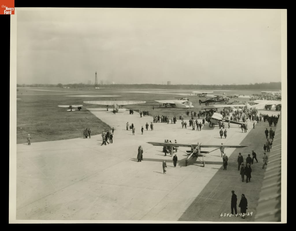 Airplanes are gathered on the tarmac at Ford Airport in Dearborn, Michigan, in this 1929 view. In the distance, at center left, is the mooring mast built for airships in 1925. With paved runways, a modern terminal building, and a hotel (built in 1931) located just across the street, Ford Airport was among the best-equipped facilities of its day.