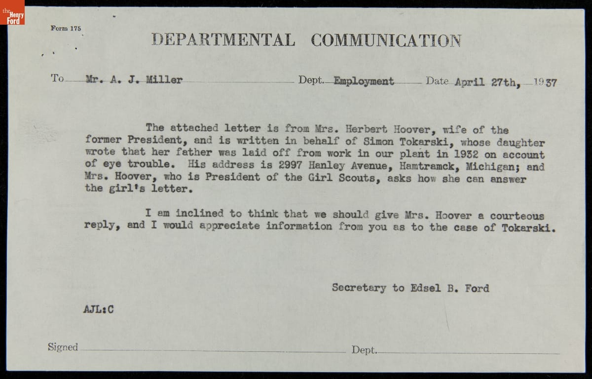 To Mr. A.J. Miller Dept. Employment April 27 1937 / The attached letter is from Mrs. Herbert Hoover, wife of the / former President, and is written in behalf of Simon Tokarski, whose daughter / wrote that her father was laid off from work in our plant in 1932 on account / of eye trouble. His address... / and Mrs. Hoover who is President of the Girl Scouts, asks how she can answer / the girl's letter. / I am inclined to think that we should give Mrs. Hoover a courteous / reply, and I would appreciate information from you as to the case of Tokarski. / Secretary to Edsel B. Ford / AJL:C