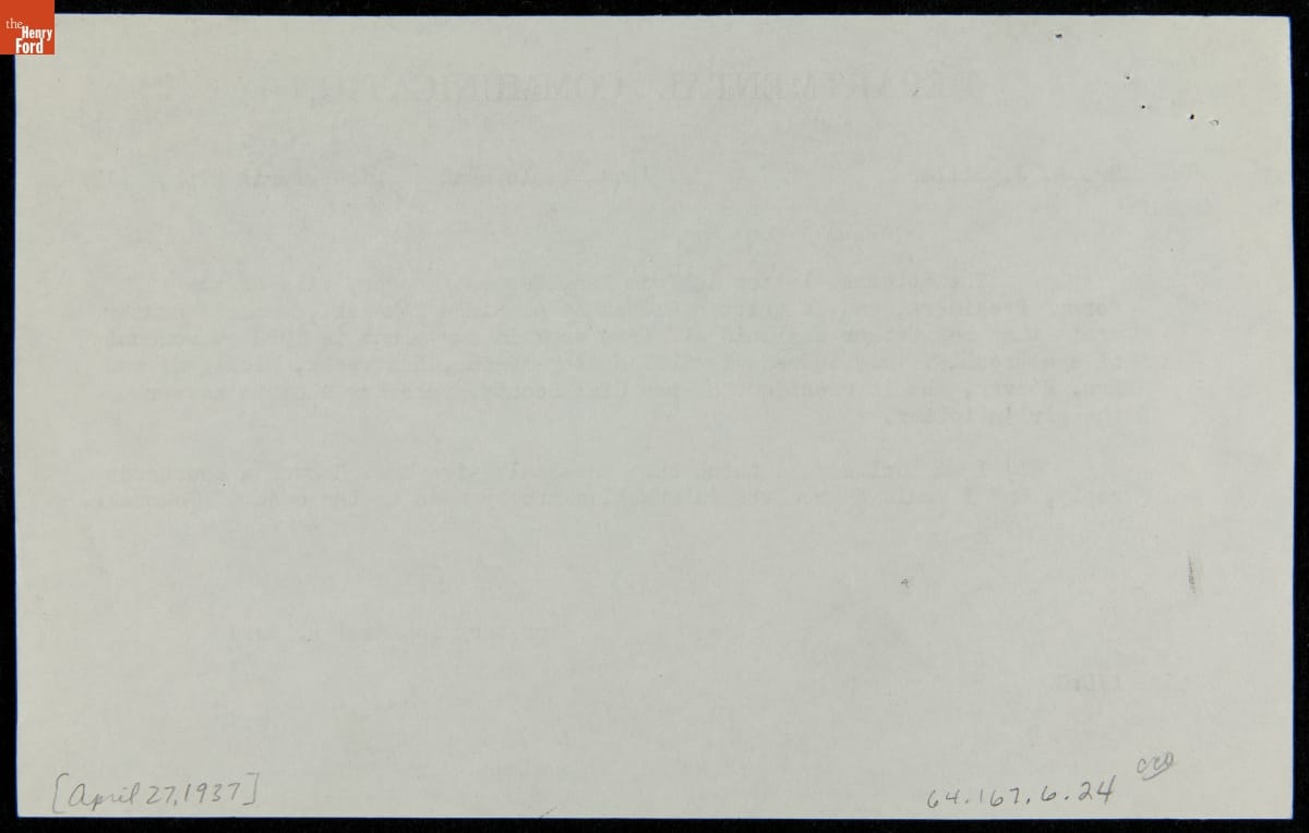 Ford Motor Company Memo regarding an Inquiry from Mrs. Herbert Hoover about Former Employee Simon Tokarski, 1937
