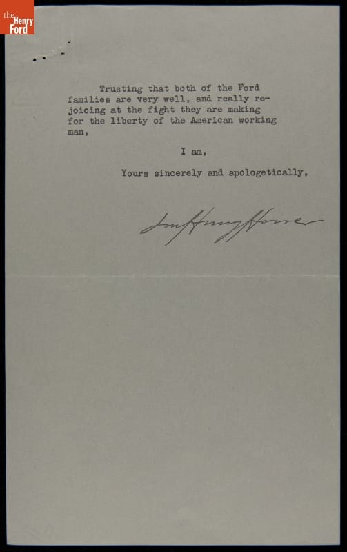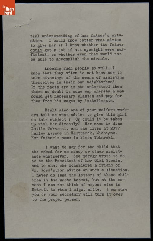Lou Henry Hoover, former First Lady and president of the Girl Scouts of the United States of America, wrote this letter to Edsel Ford, president of Ford Motor Company, on behalf of a young Girl Scout. The girl's father, a former Ford employee, was out of work. Within days of receiving Hoover's inquiry, Ford rehired the man.