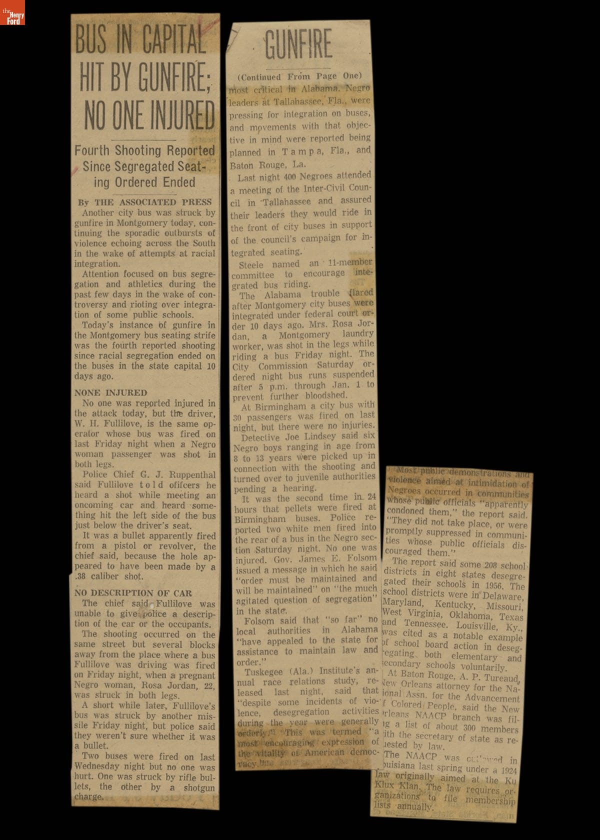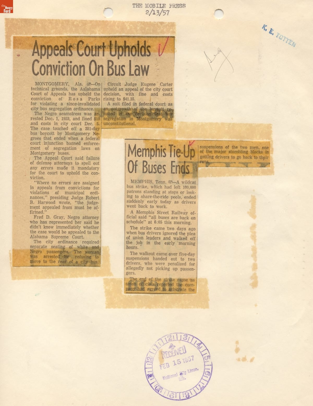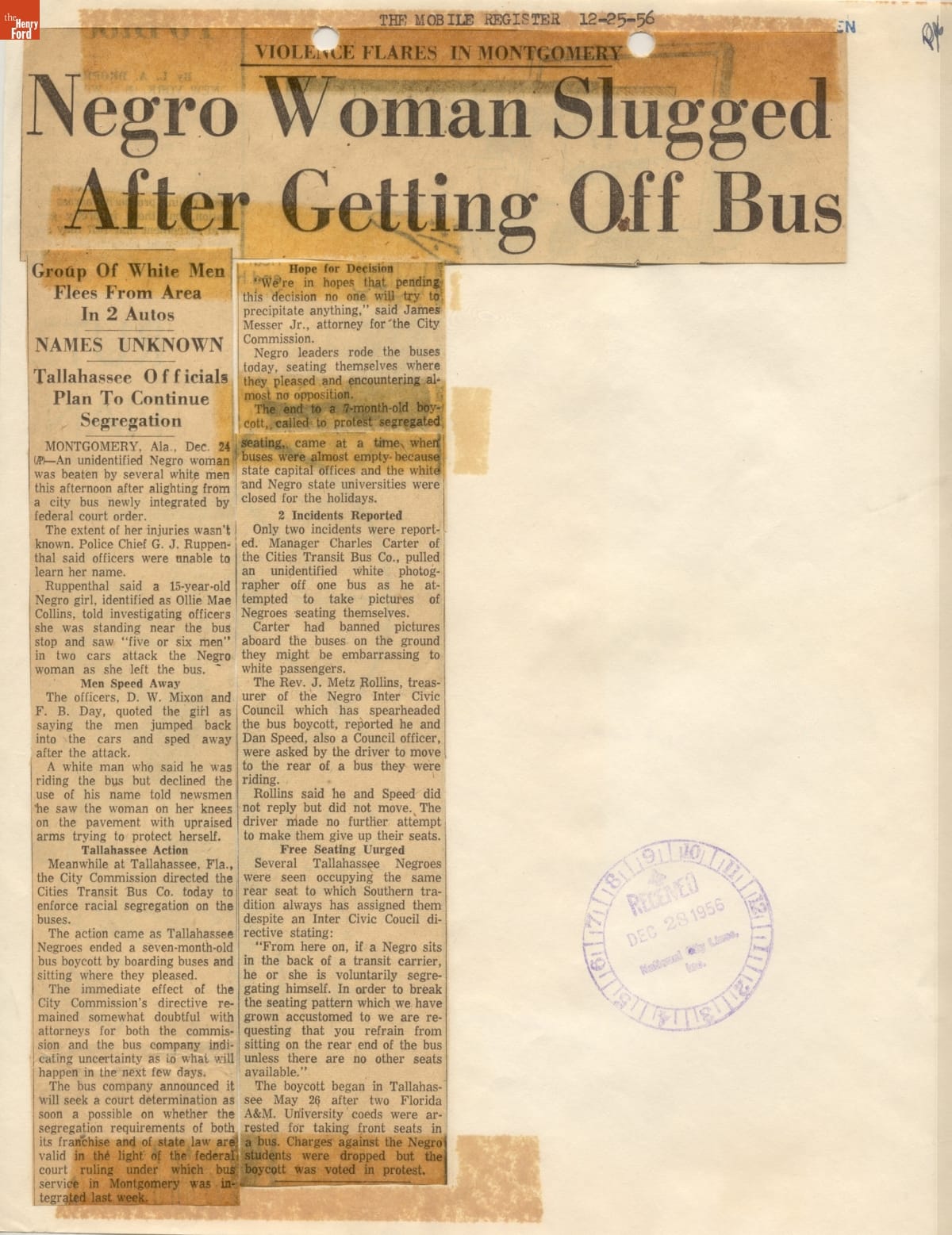These newspaper articles come from a scrapbook of newspaper clippings saved by Charles "Homer" Cummings, a Montgomery City bus lines manager. Together, these articles recount the story of the 381-day Montgomery bus boycott that was inspired by the arrest of Rosa Parks, who refused to give up her bus seat to a white man despite existing segregation laws.