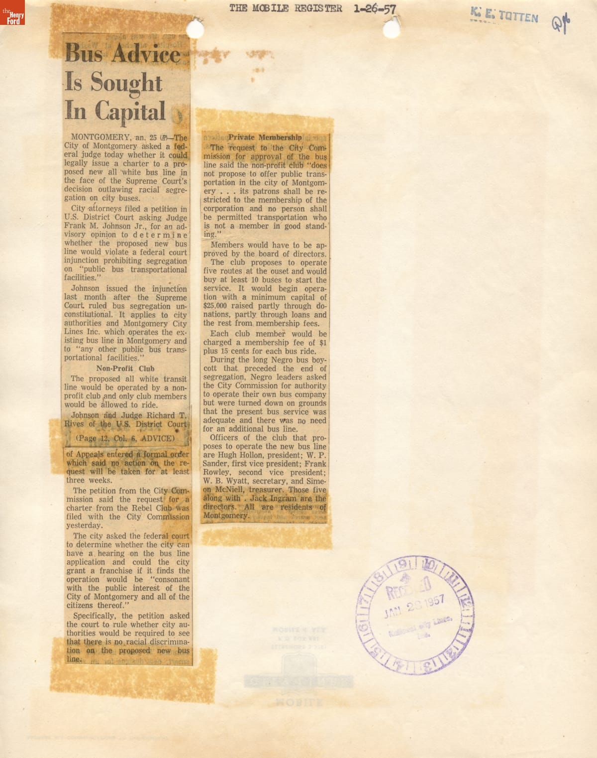 THF147539 / Montgomery Bus Boycott Scrapbook, November 1955 - April 1957 (Part 6 of 6) / January 19, 1957