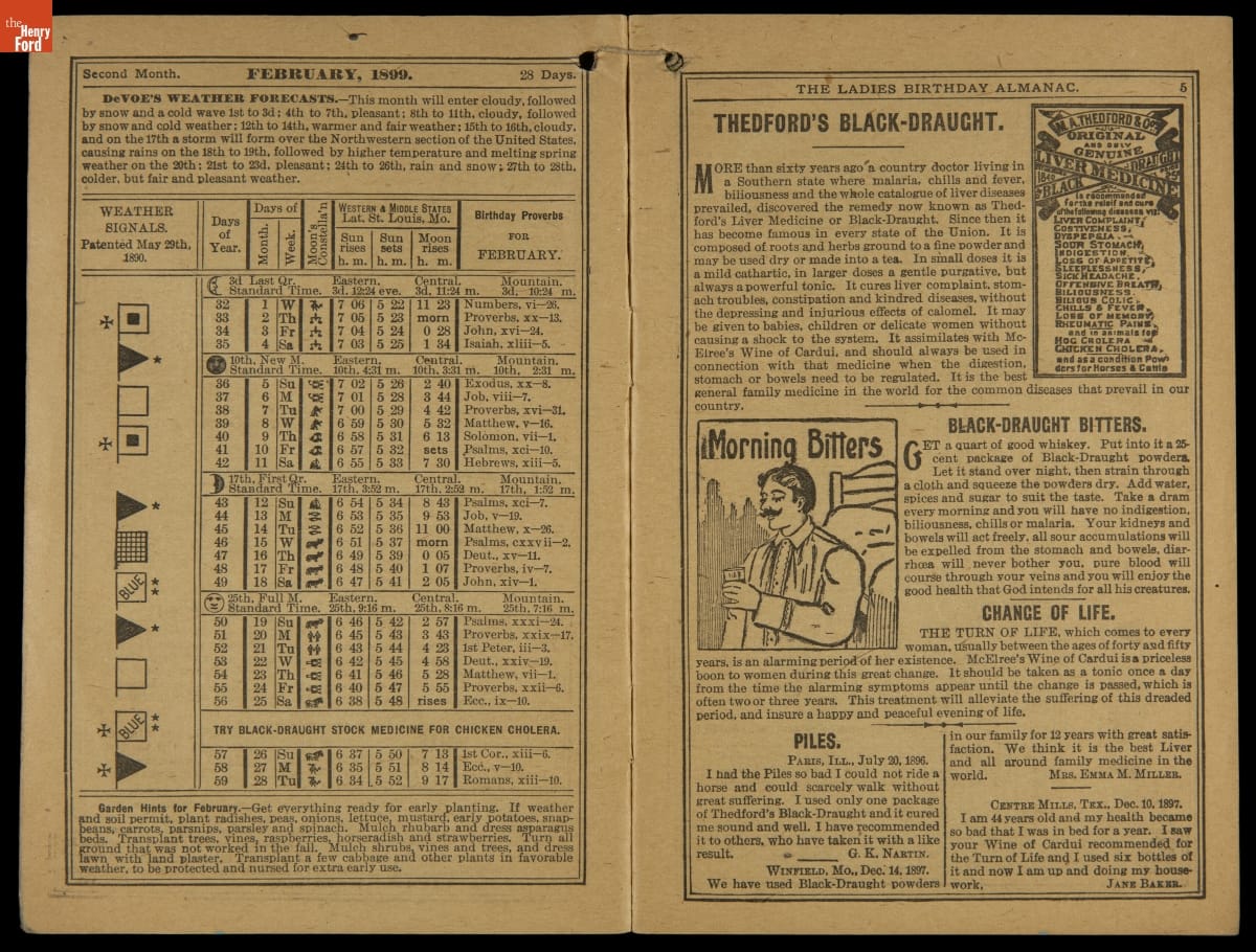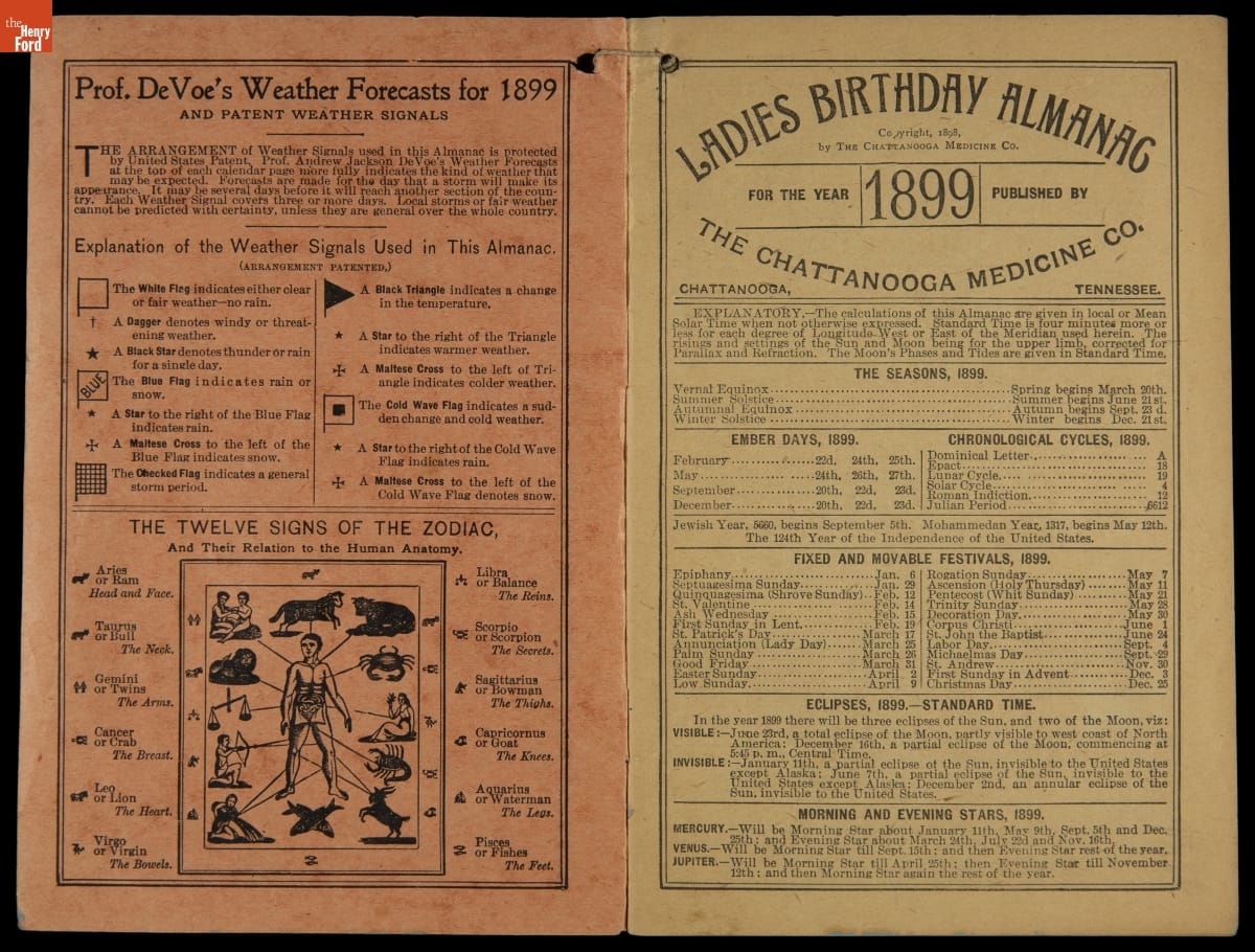Almanacs contained practical information about the coming year. Readers normally found a calendar, weather predictions, tide schedules, and information related to astronomical events, agriculture, health, politics and other matters. Interspersed were jokes and witty sayings. The Chattanooga Medicine Company published this almanac as a way to promote and market its products.