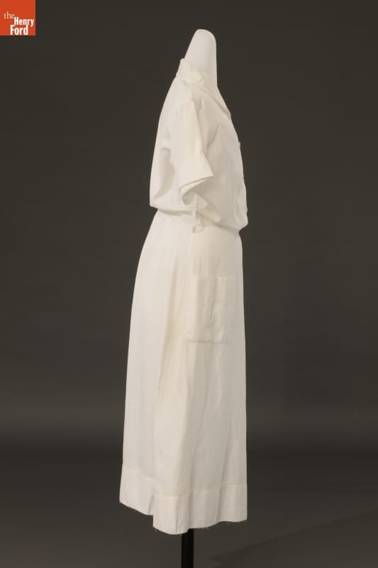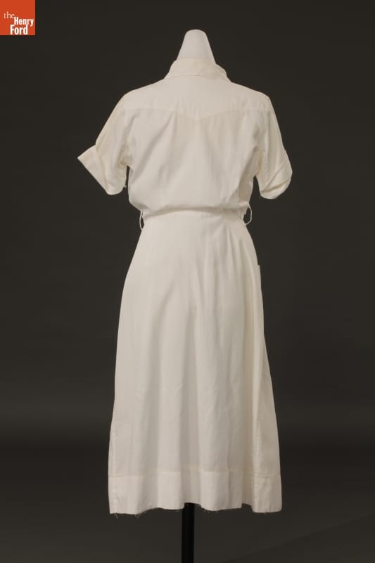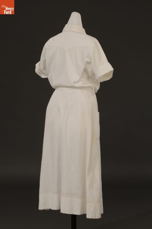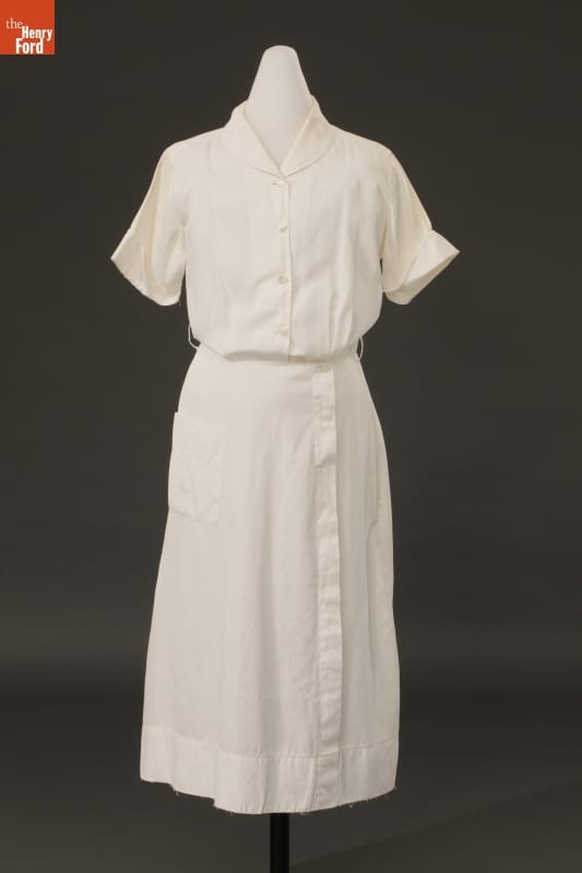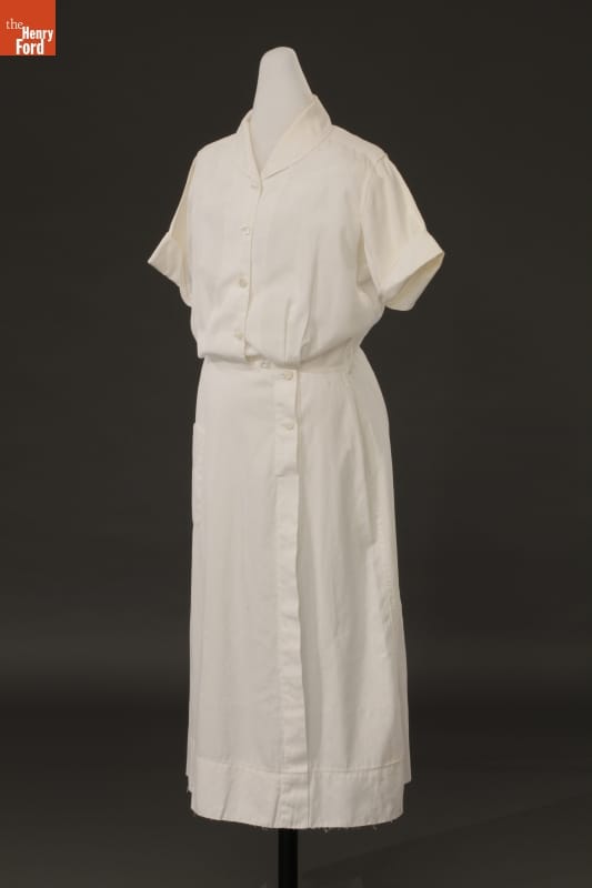 For decades, nurses' uniforms were white -- in the early 1900s, white was considered more sanitary and scientific. Nurses wore a crisp white dress, white cap, white hose, and sturdy white shoes. The uniform was reassuring to patients who knew their care was in the hands of a trained professional. Marie Goltry wore this uniform after graduating from nursing school in 1957.