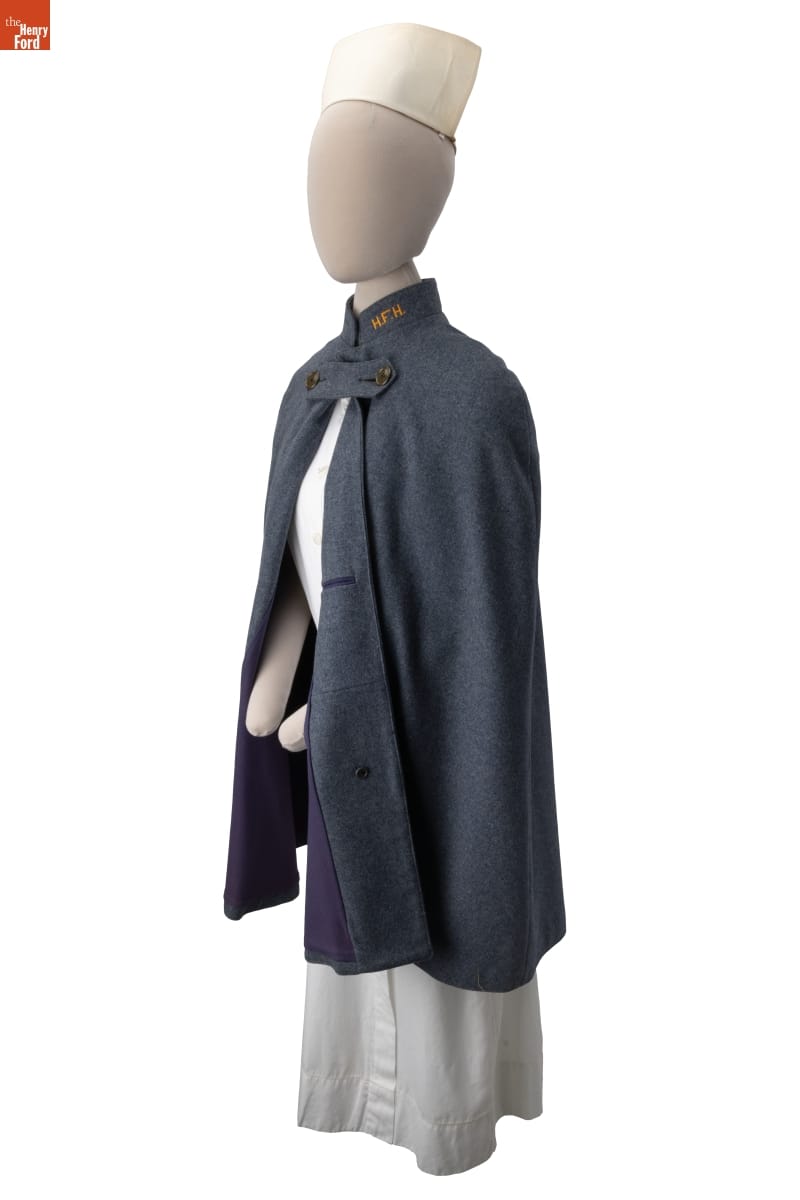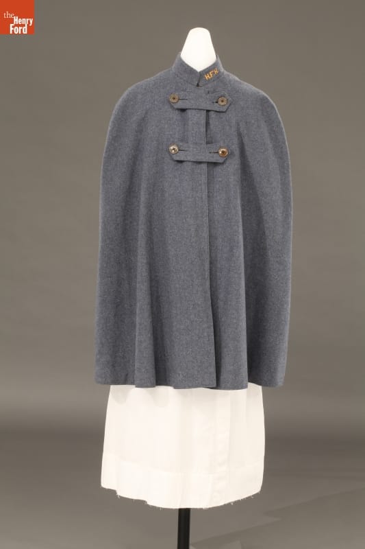For decades, nurses' uniforms were white -- in the early 1900s, white was considered more sanitary and scientific. Nurses wore a crisp white dress, white cap, white hose, and sturdy white shoes. The uniform was reassuring to patients who knew their care was in the hands of a trained professional. This gray wool flannel cape protected against the cold.