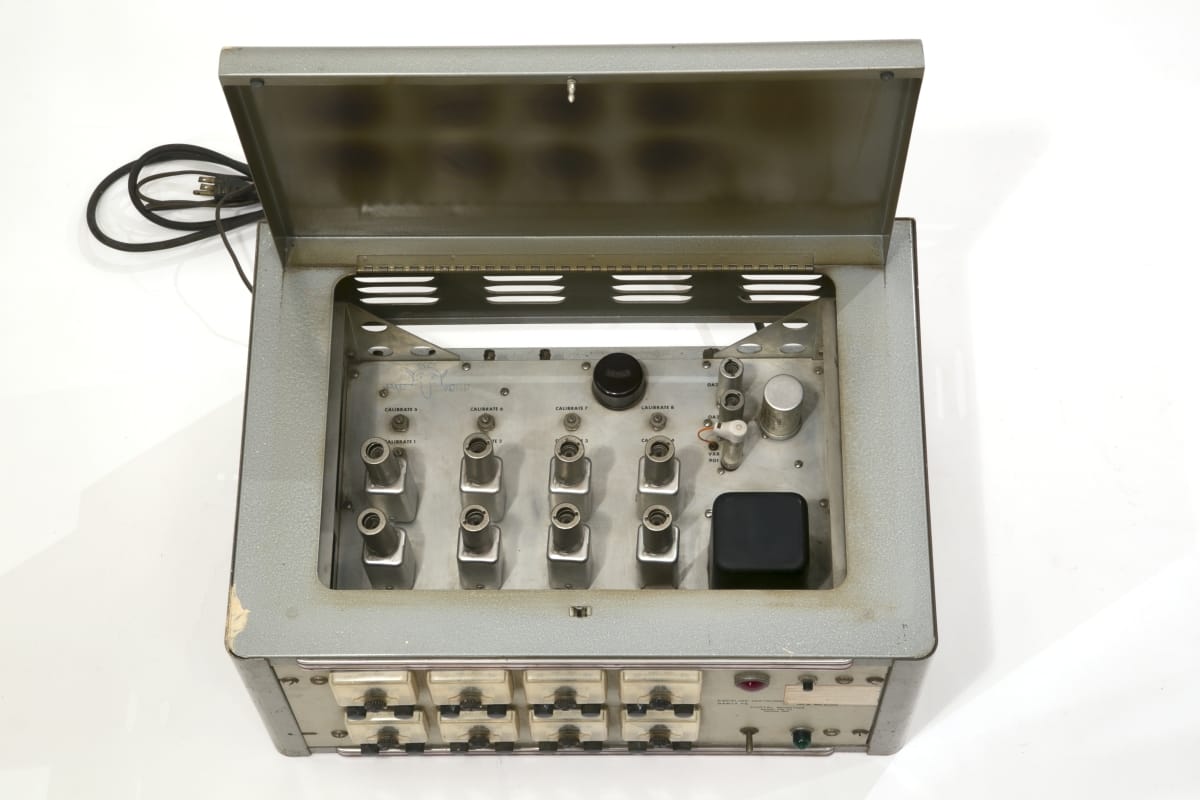Inscribed on front of monitor: Channel 1 [thru 8] / 0 . . . 1000 COUNTS/MINUTE / OFF/ON RESPONSE / ALARM / EBERLINE INSTRUME [obscured] / SANTA FE NEW MEXICO / MODEL PM-2A / SERIAL 180 / OFF POWER