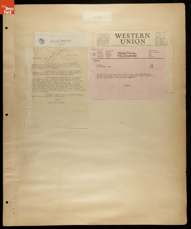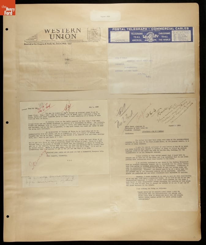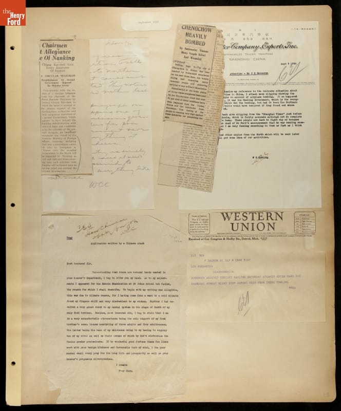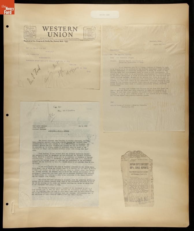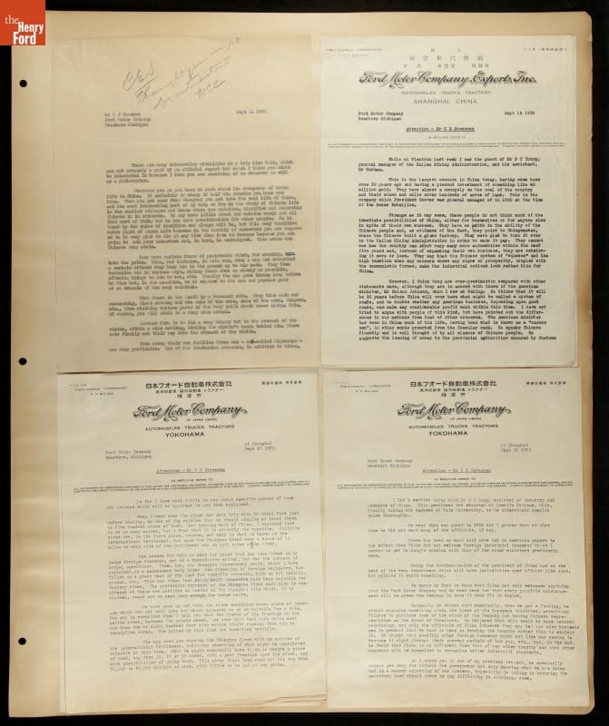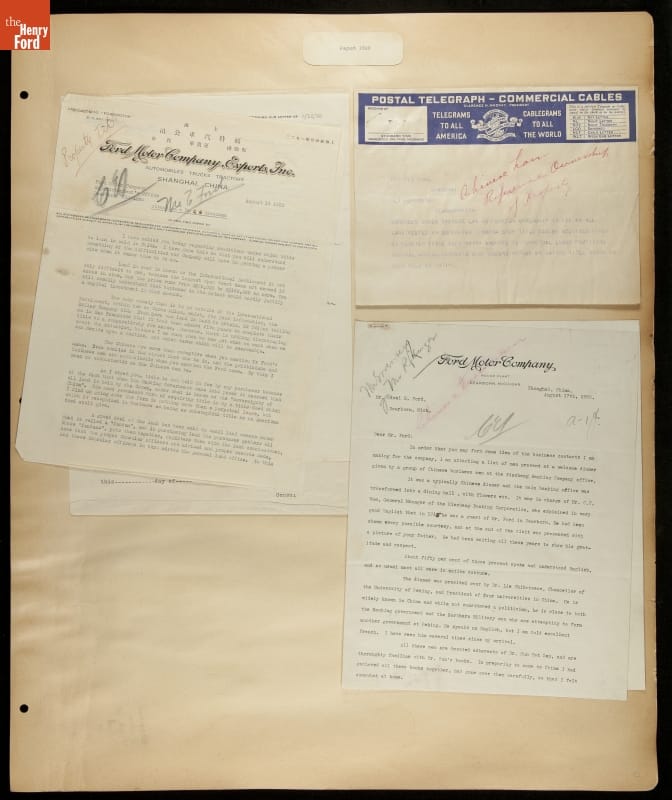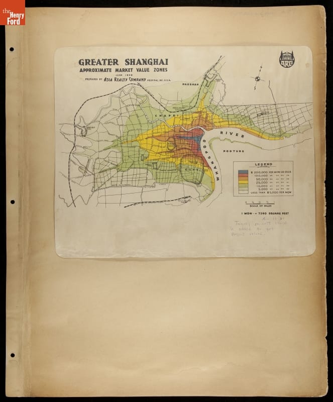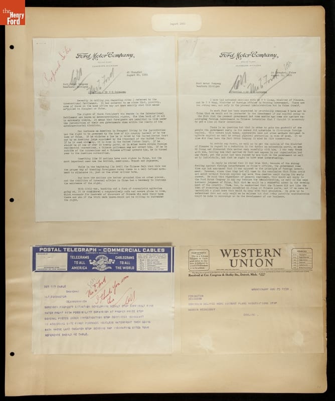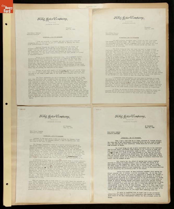 Ford Motor Company operated sales and service branches in cities around the world. The company considered building an assembly plant in Shanghai, China. This scrapbook was put together during the study. Ford decided against the idea when it learned that Chinese law required the property to be owned by a citizen of China.