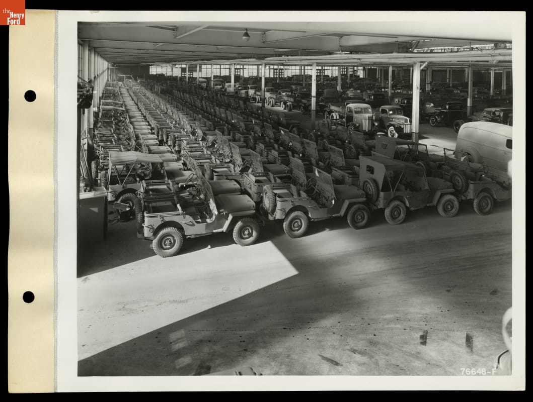 Like other American automakers, Ford Motor Company suspended civilian production during World War II. Instead, the company devoted its employees and factories to manufacturing Allied war materiel. Ford facilities produced aircraft engines, bomber airplanes, gliders, tanks, armored cars, and -- as seen here -- GPW jeep vehicles. More than 282,000 jeeps rolled off Ford assembly lines from 1941-1945.