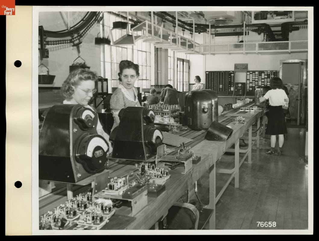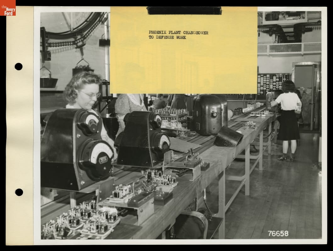 In the 1920s and '30s, Henry Ford set up small-scale factories throughout southeast Michigan. These "Village Industries" supplied Ford with tools and vehicle parts. Employees at his Phoenix Mill factory made electrical parts and voltage regulators. Most of this factory's employees were women. This photo was taken in 1942 during a period of changeover from automotive parts production to defense work.
