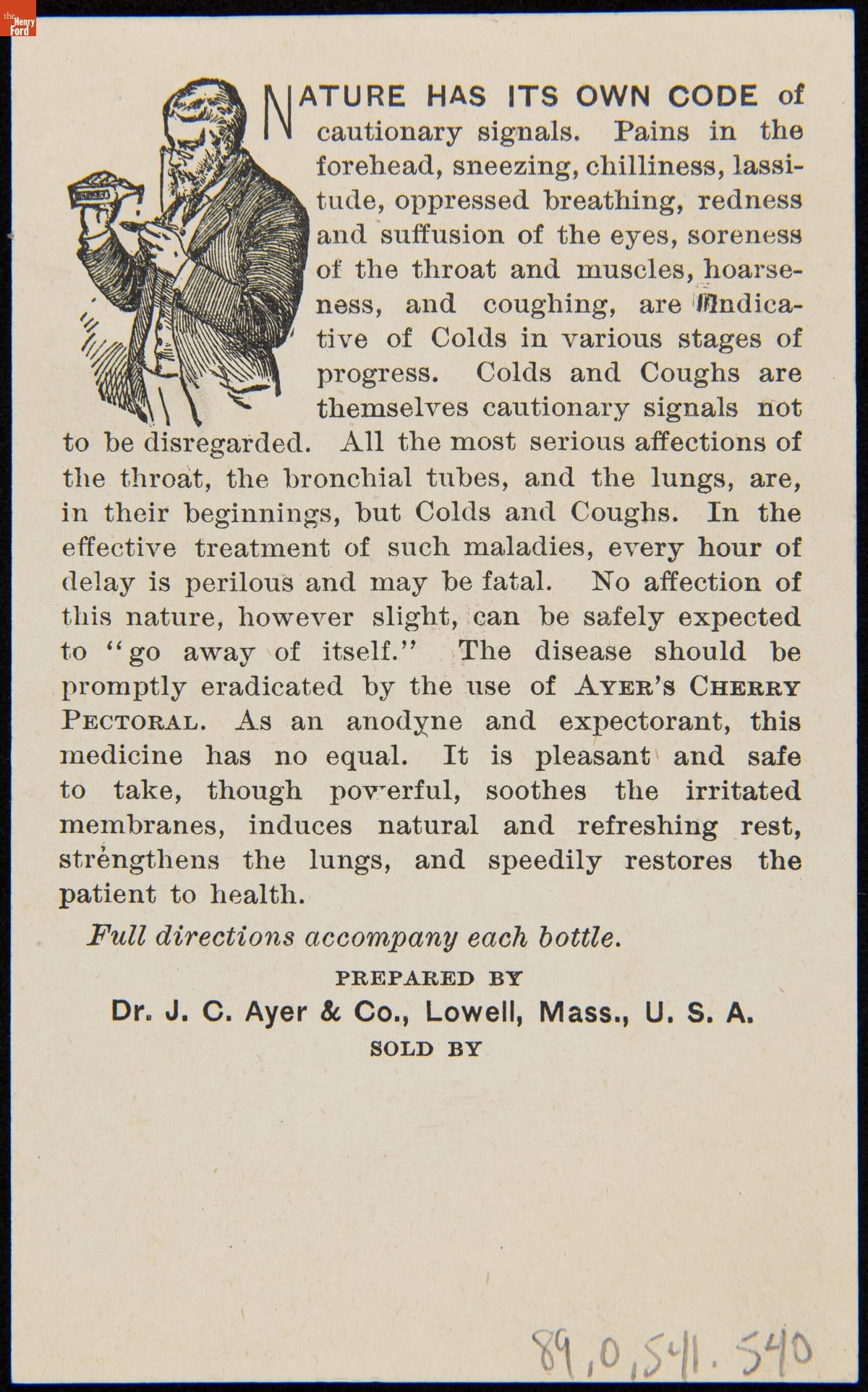 James C. Ayer (1818-1878), a purveyor of patent medicines in the 19th century, claimed his treatments could cure colds, coughs, and other ailments, purify the blood, and invigorate the hair. Ayer--and later his company--successfully marketed his products by printing thousands of trade cards, almanacs, and newspaper and magazine ads. Ayer's company continued production well into the 20th century.