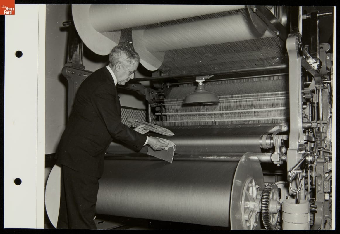 Ford Motor Company poured resources into the 1939-40 New York World's Fair, spending more than $5 million to construct and maintain its elaborate and well-attended exhibition space. Special guests numbered among Ford's 15 million reported exposition visitors. This photograph shows author Herbert Thompson Strong with one of the Ford building's many industrial displays.