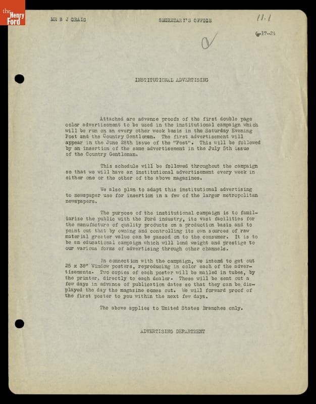 Memo from Ford Advertising Department about the 1924 Institutional Message Advertising Campaign, June 17, 1924