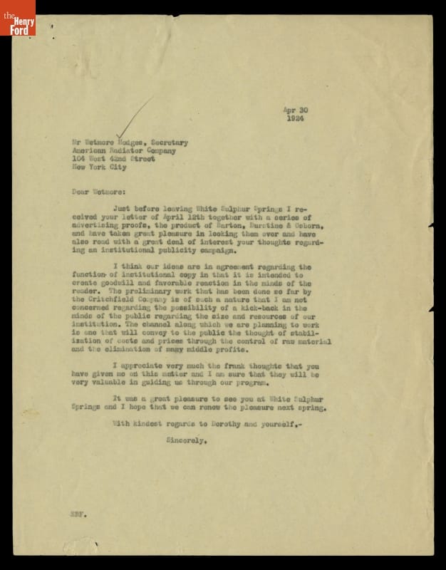 Letter from Edsel Ford to Wetmore Hodges regarding Ford's 1924 Institutional Message Advertising Campaign, April 30, 1924