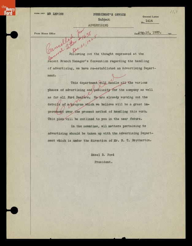 Memo from Edsel Ford Announcing the New Ford Motor Company Advertising Department, August 10, 1923
