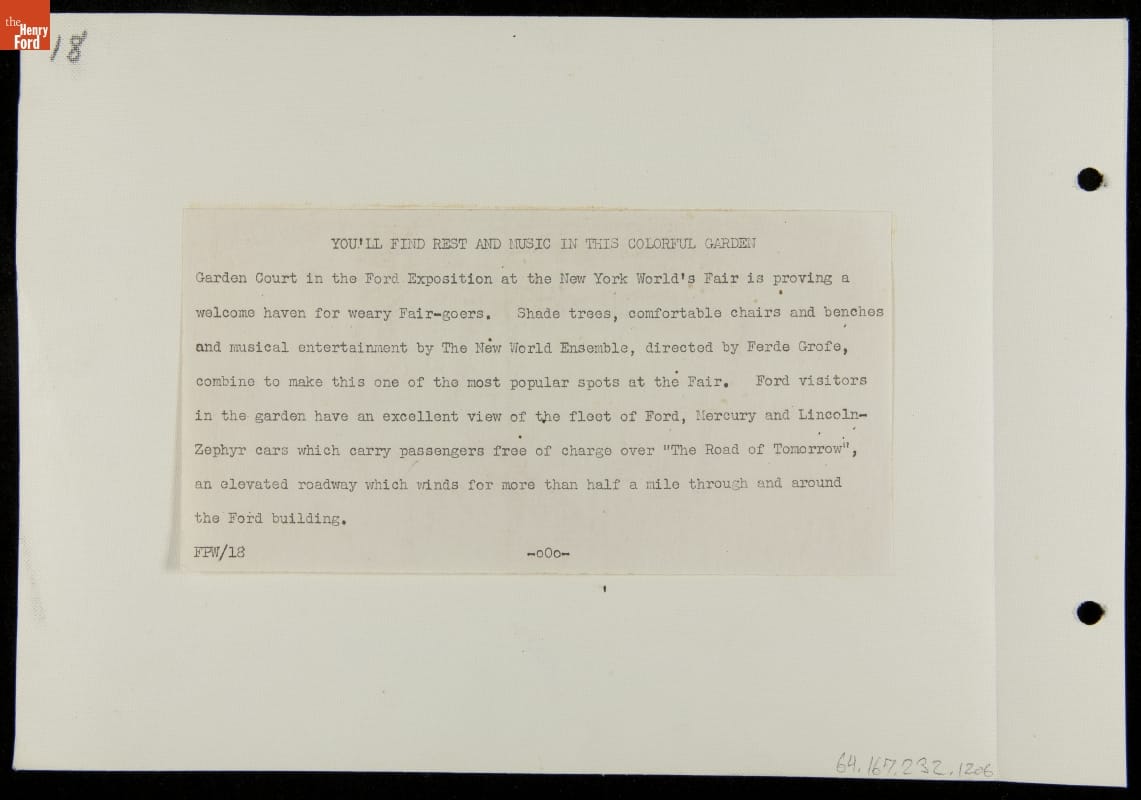 Ford Motor Company poured resources into the 1939-40 New York World's Fair, spending more than $5 million to construct and maintain its elaborate and well-attended exhibition space. Fairgoers who visited Ford's exposition could view educational demonstrations, peruse exhibits, enjoy complimentary entertainment, and take a ride on the Road of Tomorrow experience.