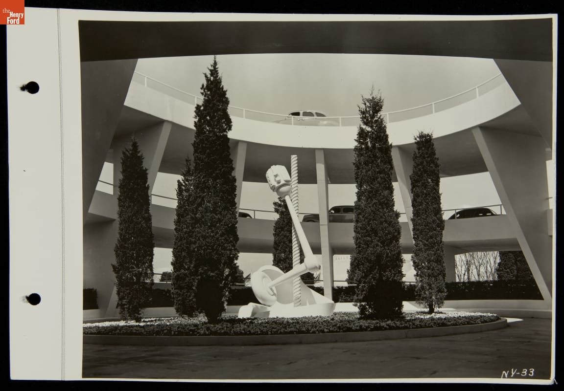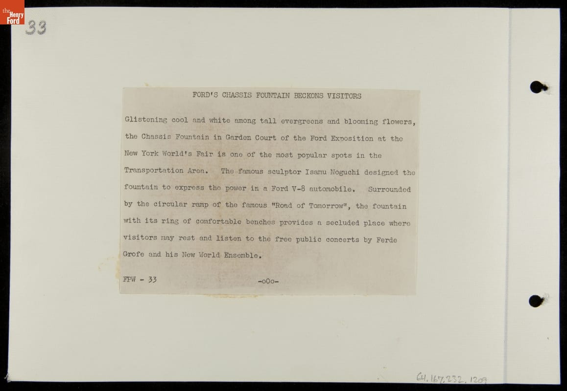 Ford Motor Company, a major participant in the 1939-40 New York World's Fair, hired sculptor Isamu Noguchi to design a fountain for its exhibition building in New York City's Flushing Meadows-Corona Park. Noguchi used automobile parts to create a fountain that both fit the fair's "Building the World of Tomorrow" theme and expressed the power of Ford's revolutionary V-8 engine.
