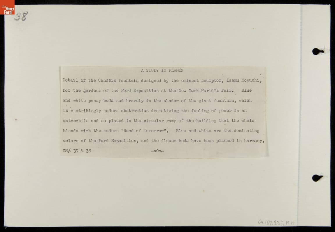Ford Motor Company, a major participant in the 1939-40 New York World's Fair, hired sculptor Isamu Noguchi to design a fountain for its exhibition building in New York City's Flushing Meadows-Corona Park. Noguchi used automobile parts to create a fountain that both fit the fair's "Building the World of Tomorrow" theme and expressed the power of Ford's revolutionary V-8 engine.