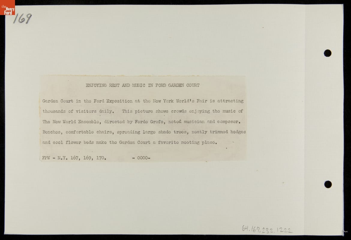 Ford Motor Company was a major participant in the 1939-40 New York World's Fair. In addition to educational demonstrations and exhibits, the Ford building offered free entertainment and comfortable places for visitors to rest. Outside in the Ford Exposition Garden Court, fairgoers could relax and listen to musical performances by Ferde Grofe's innovative New World Orchestra.