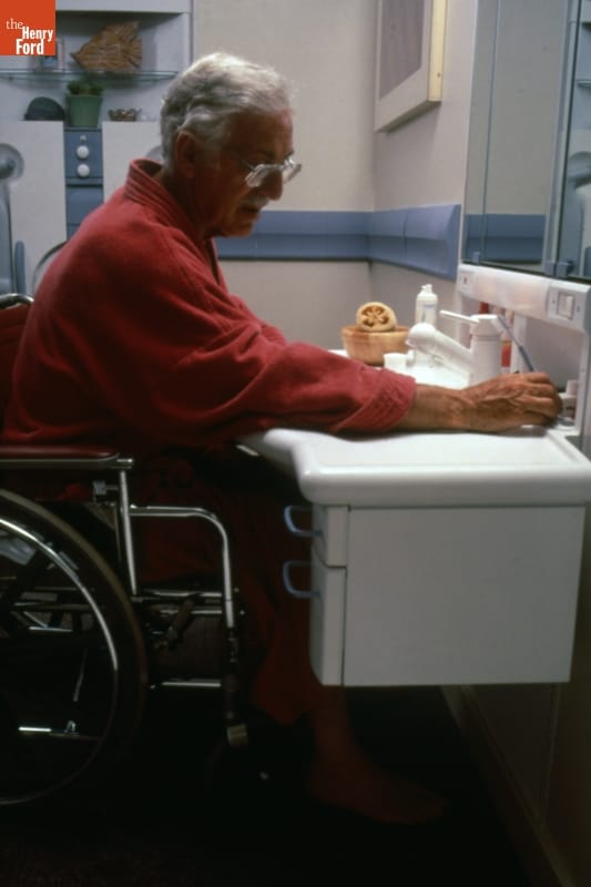 Man in Wheelchair Using MetaForm Adjustable Bathroom Sink, circa 1987